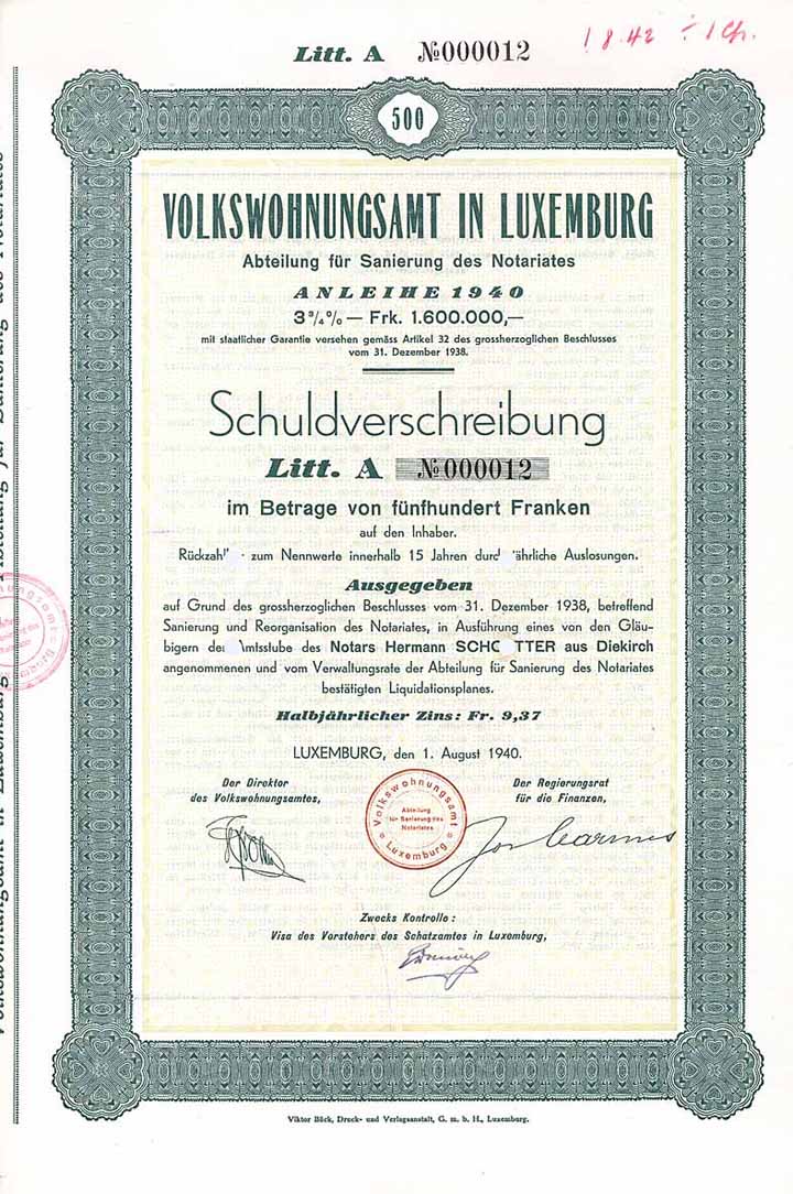 | Vorheriges Los | Zurück | Nächstes Los | | Losnr.: | 1043 (Luxemburg) | | Titel: | Volkswohnungsamt in Luxemburg | | Auflistung: | 3,75 % Anleihe 500 lfr. 1.8.1940. | | Ausruf: | 40,00 EUR | Ausgabe- datum: | 01.08.1940 | Ausgabe- ort: | Luxemburg | | Abbildung: |  | | Stücknr.: | 12 | | Besonder-heiten: | Mit der staatlich garantierten Anleihe von 1,6 Mio. Frs. musste der Notar Hermann Schoetter aus Diekirch von seinen Gläubigern erlöst werden - da er Amtsperson war, konnte man ihn nicht einfach in Konkurs gehen lassen. Ganz ungewöhnliches Wertpapier. Text in deutsch, rückseitig Bedingungen. | | Verfügbar: | Kupons anhängend. Niedrige Nummer. | | Erhaltung: | EF | | Zuschlag: | 40,00 EUR |