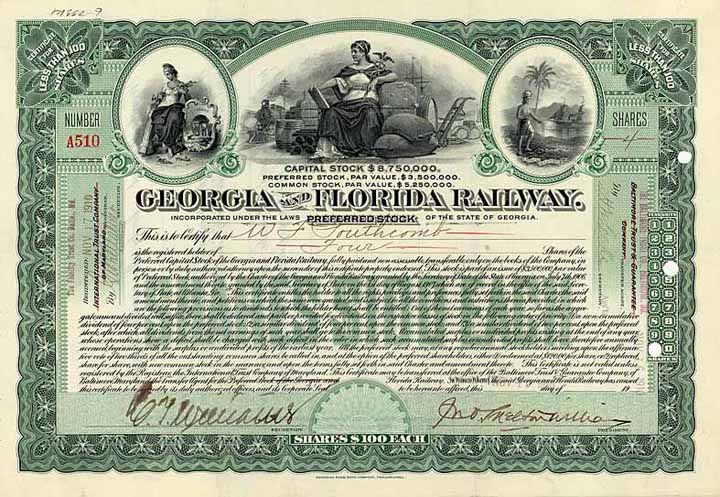 | Vorheriges Los | Zurück | Nächstes Los | | Losnr.: | 1248 (USA) | | Titel: | Georgia & Florida Railway | | Auflistung: | 4 pref. shares à 100 $ 10.11.1910. | | Ausruf: | 65,00 EUR | Ausgabe- datum: | 19.05.1919 | Ausgabe- ort: | Georgia | | Abbildung: |  | | Stücknr.: | 631 | | Info: | Die Gesellschaft wurde 1906 als Georgia & Florida Railway konzessioniert, 1907 mit 6 anderen Bahnen verschmolzen. Hauptstrecken: Keysville-Swainsboro (48 Meilen), Millen-Vidalia (53 Meilen) und Hazlehurst-Madison (122 Meilen). 1926 nach Konkurs unter sonst gleichem Namen als „Railroad“ reorganisiert. | | Besonder-heiten: | Grün/schwarzer Stahlstich der ABNC mit drei tollen Vignetten. | | Erhaltung: | EF- | | Zuschlag: | 65,00 EUR |