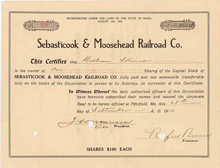 | Vorheriges Los | Zurück | Nächstes Los | | Losnr.: | 1376 (USA) | | Titel: | Sebasticook & Moosehead Railroad | | Auflistung: | 1 share á 100 $ 28.9.1910. | | Ausruf: | 30,00 EUR | Ausgabe- datum: | 28.09.1910 | Ausgabe- ort: | Pittsfield, Maine | | Abbildung: |  | | Stücknr.: | 39 | | Info: | 1886 (inkorporiert erst 1903) im Staat Maine gegründete Lokalbahn. Die Stadt Monson, Me. benötigte die Eisenbahn zum Abtransport der Erzeugnisse ihrer Steinbrüche. Sie organisierte schon in den 1880er Jahren die Monson & Athens RR, die Richtung Süden baute, sowie die Sebasticook & Moosehead RR, die am Sebasticook River entlang nach Norden baute, bis sie bei Pittsfield auf die Hauptlinie der Maine Central traf. 1901 wurde die Bahn bis Mainstream verlängert, 1910 an die Maine Central verpachtet und 1911 von dieser komplett geschluckt, 1912 noch bis Harmony verlängert. Diese „Harmony Branch“ der Maine Central wurde in Teilen 1966, endgültig erst 1983 stillgelegt. | | Besonder-heiten: | Ebenfalls Prägesiegel mit Elchkopf („Moosehead“), ansonsten völlig anders gestaltet als das vorige Los. | | Erhaltung: | EF- | | Zuschlag: | 32,00 EUR |