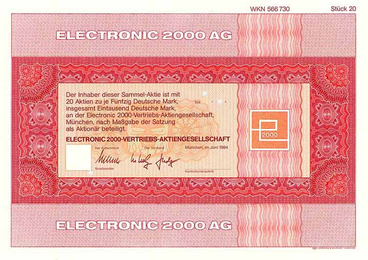 | Vorheriges Los | Zurück | Nächstes Los | | Losnr.: | 872 (Deutschland nach 1945) | | Titel: | Electronic 2000-Vertriebs-AG | | Auflistung: | Aktie 20 x 50 DM Juni 1984 (Muster, R 9). | | Ausruf: | 40,00 EUR | Ausgabe- datum: | 01.06.1984 | Ausgabe- ort: | München | | Abbildung: |  | | Info: | Gründung 1971 als GmbH. Der Durchbruch kam für diesen Distributor elektronischer Bauteile 1976 durch den Vertragsabschluß mit Intel. 1982 Umwandlung in eine AG, gleichzeitig Gang an die Münchener Börse. Anfang der 90er Jahre leiteten dann herbe Verluste den Niedergang ein. Heute E'Zwo GmbH. | | Verfügbar: | Lochentwertet. Mit Kuponbogen. (R 9) | | Erhaltung: | EF+ | | Zuschlag: | 44,00 EUR |