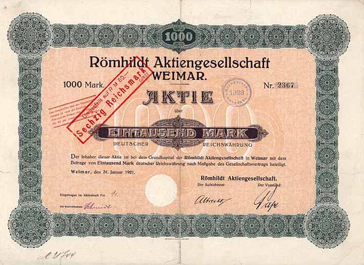| Vorheriges Los | Zurück | Nächstes Los | | Losnr.: | 607 (Deutschland) | | Titel: | Römhildt AG | | Auflistung: | Aktie 1.000 Mark 31.1.1921 (Auflage 2400, R 9). | | Ausruf: | 50,00 EUR | Ausgabe- datum: | 31.01.1921 | Ausgabe- ort: | Weimar | | Abbildung: |  | | Stücknr.: | 1982 | | Info: | Gründung 1845, AG seit 1891 (Firma bis 1911: Römhildt-Pianofortefabrik AG, 1911-18 Römhildt-Heilbrunn Söhne AG). 1899 Neubau der Fabrik in Weimar, Hinterm Bahnhof 12, 1910 Errichtung eines großen Erweiterungsbaus. Filialen in Berlin und Hamburg. Börsennotiz: Freiverkehr Leipzig. 1930 Verkauf eines Teils des Fabrikgrundstücks in Weimar und Abtretung eines Teils der Produktion an die Pianofortefabrik A. Herrmann AG in Sangerhausen. 1931 Konkurs. | | Verfügbar: | Weniger als 10 unentwertete Stücke sind seit vielen Jahren bekannt. Kleinere Einrisse fachgerecht restauriert. (R 9) | | Erhaltung: | VF | | Zuschlag: | offen |