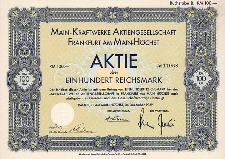 | Vorheriges Los | Zurück | Nächstes Los | | Losnr.: | 487 (Deutschland) | | Titel: | Main-Kraftwerke AG | | Auflistung: | Aktie 100 RM Dez. 1929 (Auflage 13000, R 2). | | Ausruf: | 28,00 EUR | Ausgabe- datum: | 01.12.1929 | Ausgabe- ort: | Frankfurt a.M. | | Abbildung: |  | | Stücknr.: | 9619 | | Info: | Bei der Gründung 1910/11 wurde sogleich der Bau eines (erst 1999 stillgelegten und 2005 abgerissenen) Kohlekraftwerks am Mainufer in Höchst in Angrif genommen. Hauptgründer waren die "Felten und Guilleaume-Lahmeyerwerke AG", Köln und die "Elektrizitäts-AG vorm. W. Lahmeyer & Co.", Frankfurt nach dem bewährten Muster, dass durch Gründung von Kraftwerksbetrieben die eigenen elektrotechnischen Erzeugnisse mehr Absatz fanden. Später kam das RWE als Großaktionär dazu. Die in Frankfurt börsennotierte Gesellschaft belieferte in der sehr industriereichen Umgebung Frankfurts fast 400 Gemeinden mit über 300.000 Einwohnern mit Energie. 2001 Fusion mit der Kraftwerk Altwürttemberg AG (KAWAG), dem Überlandwerk Achern, der Kraftversorgung Rhein-Wied AG, dem Elektrizitätswerk Bad Homburg und der Rheingau Elektrizitätswerke GmbH zur heutigen Süwag Energie AG. Aktuell arbeiten fast 1.800 Beschäftigte für etwa 0,9 Mio. Strom- und Gasabnehmer, die für fast 2 Mrd. € Jahresumsatz stehen. Eigenstromerzeugung findet heute nur noch in 8 Laufwasserkraftwerken an der Lahn und weiteren 8 Laufwasserkraftwerken an den Flüssen Neckar, Kinzig, Wied und Elsenz statt, der größte Teil wird aber fremdbezogen. Großaktionär ist das RWE mit 77,58 %, insgesamt 16 kommunale Anteilseigner kommen auf 22,3 % (darunter 5,98 % bei den Stadtwerken Frankfurt am Main), eine kleine Handvoll privater Kleinaktionäre hält noch 0,12 %. | | Besonder-heiten: | Lochentwertet (RB). | | Verfügbar: | R 2 | | Erhaltung: | EF- | | Zuschlag: | offen |