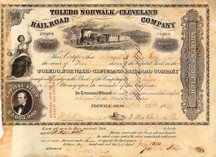 | Vorheriges Los | Zurück | Nächstes Los | | Losnr.: | 1392 (USA) | | Titel: | Toledo, Norwalk & Cleveland Railroad | | Auflistung: | 10 shares à 50 $ 6.12.1852. | | Ausruf: | 240,00 EUR | Ausgabe- datum: | 26.10.1852 | Ausgabe- ort: | Norwalk, Ohio | | Abbildung: |  | | Stücknr.: | 359 | | Info: | Konzessioniert 1850 für den Bau der Schmalspurbahn von Toledo-Ost nach Grafton (1853 fertiggestellt). In Wellington bestand Anschluß an die Cleveland, Columbus & Cincinnati RR. Mit letzterer sowie der Port Clinton RR bereits im Sept. 1853 zur Cleveland & Toledo RR verschmolzen. Damit besaß die Lake Shore & Michigan Southern Ry. eine durchgehende Strecke von Cleveland, O. nach Chicago, Ill.; 1867 „schluckte“ sie die Bahn vollständig. 1914 dann zum New York Central System gekommen und damit 1968 zum Penn Central System. | | Besonder-heiten: | Mit drei schönen Vignetten: Personenzug in weiter Landschaft, weibliche Allegorie mit Friedenstaube auf der Erdkugel, Portät des Bahnpräsidenten. | | Verfügbar: | Äußerst selten. | | Erhaltung: | VF- | | Zuschlag: | offen |