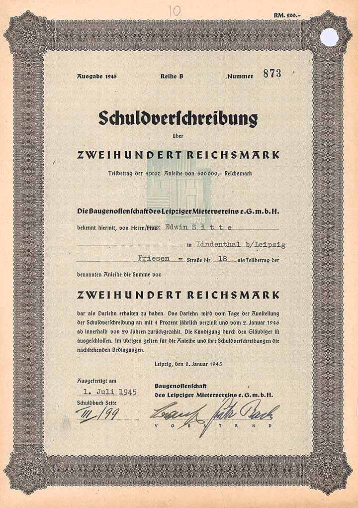 | Vorheriges Los | Zurück | Nächstes Los | | Losnr.: | 75 (Deutschland) | | Titel: | Baugenossenschaft des Leipziger Mietervereins eGmbH | | Auflistung: | 4 % Namens-Teilschuldv. 200 RM 2.1.1945 (Auflage 500, R 9). | | Ausruf: | 40,00 EUR | Ausgabe- datum: | 02.01.1945 | Ausgabe- ort: | Leipzig | | Abbildung: |  | | Stücknr.: | 882 | | Info: | Gegründet 1899. Gehört heute zur Baugenossenschaft Leipzig eG. | | Besonder-heiten: | Teil einer Anleihe von 500.000 RM. Lochentwertet (RB). | | Verfügbar: | Nur 10 Stück lagen im Reichsbankschatz. Doppelblatt. (R 9) | | Erhaltung: | EF | | Zuschlag: | 40,00 EUR |