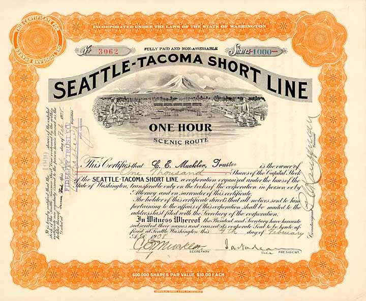 | Vorheriges Los | Zurück | Nächstes Los | | Losnr.: | 1380 (USA) | | Titel: | Seattle-Tacoma Short Line | | Auflistung: | 1.000 shares à 10 $ 4.2.1908. | | Ausruf: | 80,00 EUR | Ausgabe- datum: | 04.02.1908 | Ausgabe- ort: | Seattle, Wash. | | Abbildung: |  | | Stücknr.: | 3050 | | Info: | Gegründet 1907 zum Bau der „One Hour Scenic Route“, einer Bahnverbindung zwischen den Städten Seattle und Tacoma. Nachdem die Bahn 1915 immer noch nicht fertig war, wurde die Konzession widerrufen. Die Trasse wurde später für den Bau des „Seattle-Tacoma Short Line Highway“ (Pacific Highway South) benutzt. | | Besonder-heiten: | Druck in leuchtorange/schwarz, herrliche große Vignette mit Ansichten von Seattle und Tacoma und der die beiden Städte verbindenden Bahn, im Hintergrund der 4.392 m hohe Vulkan Mount Rainier. | | Verfügbar: | Unentwertet, sehr selten. | | Erhaltung: | UNC-. | | Zuschlag: | 90,00 EUR |