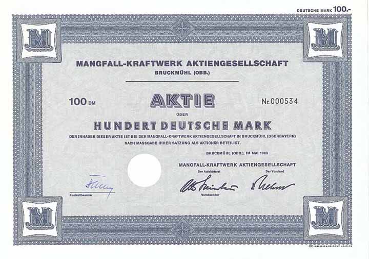 | Vorheriges Los | Zurück | Nächstes Los | | Losnr.: | 908 (Deutschland nach 1945) | | Titel: | Mangfall-Kraftwerk AG | | Auflistung: | Aktie 100 DM Mai 1969 (Auflage 9000, R 5). | | Ausruf: | 30,00 EUR | Ausgabe- datum: | 01.05.1969 | Ausgabe- ort: | Bruckmühl (Obb.) | | Abbildung: |  | | Stücknr.: | 7463 | | Info: | Gründung 1953 durch die Papierfabrik Steinbeis (die immer mit über 75 % beteiligt blieb) zum Betrieb zweier Wasserkraftwerke an der Mangfall. Wegen der besonders familiären Hauptversammlungen einer der damals am meisten gesuchten nicht börsennotierten Spezialwerte. In den 1990er Jahren nach Verkauf der Kraftwerke in Liquidation getreten. | | Verfügbar: | R 5 | | Erhaltung: | EF | | Zuschlag: | offen |