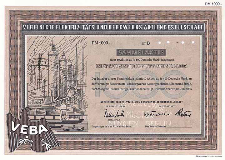 | Vorheriges Los | Zurück | Nächstes Los | | Losnr.: | 1021 (Deutschland nach 1945) | | Titel: | Vereinigte Elektrizitäts- und Bergwerks-AG | | Auflistung: | Sammelaktie Lit B 10 x 100 DM Juni 1965 (Muster). | | Ausruf: | 65,00 EUR | Ausgabe- datum: | 01.06.1965 | Ausgabe- ort: | Bonn und Berlin | | Abbildung: |  | | Info: | Bei der Gründung der VEBA 1929 brachte der Preußische Staat sämtliche Aktien der Preußischen Elektrizitäts-AG Berlin, der Preußische Bergwerks- und Hütten-AG zu Berlin, der Bergwerks-AG Recklinghausen und der Bergwerksgesellschaft Hibernia zu Herne ein. 1948 Sitzverlegung von Berlin nach Hamburg, 1961 nach Bonn und Berlin, 1966 nach Herne, 1970 Umbenennung in VEBA AG (Holdinggesellschaft mit Interessen auf den Gebieten Strom, Chemie, Öl, Telekommunikation, Distribution/Logistik, Immobilien und Silizium-Wafer) und Sitzverlegung nach Düsseldorf. Engagiert auch im Gas- und Mineralölgeschäft (ARAL). 2000 mit der VIAG zum Energie-Riesen E.ON verschmolzen. | | Besonder-heiten: | Dekoratives Stück der Veba mit Hochspannungsmasten, Kraftwerk, Schiffen. | | Verfügbar: | Mit kpl. Kuponbogen. Muster perforiert mit „Giesecke & Devrient“. (R 9) | | Erhaltung: | EF+ | | Zuschlag: | offen |