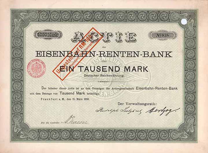 | Vorheriges Los | Zurück | Nächstes Los | | Losnr.: | 178 (Deutschland) | | Titel: | Eisenbahn-Renten-Bank | | Auflistung: | Aktie 1.000 Mark 15.3.1898. Gründeremission (Auflage 5000, R 2). | | Ausruf: | 80,00 EUR | Ausgabe- datum: | 15.03.1898 | Ausgabe- ort: | Frankfurt a.M. | | Abbildung: |  | | Stücknr.: | 915 | | Info: | Gründung 1887 auf Betreiben des Bankhauses von Erlanger & Söhne zum Erwerb von Obligationen und Prioritäts-Aktien deutscher und österreichisch-ungarischer Eisenbahngesellschaften. Der Besitz ging als Folge des 1. Weltkrieges verloren. 1942 Sitzverlegung nach München, Großaktionär war zu dieser Zeit August Lenz & Co. Letzte größere Aktiva waren Beteiligungen an der Ver. Mosaik- und Wandplattenwerke AG Sinzig und der Maschinenfabrik Anton Steinecker AG Freising. Von 1949 an firmierte die Gesellschaft als AG für Industrie und Verwaltung. 1957 in August Lenz & Co. aufgegangen. | | Besonder-heiten: | Grundkapital: 10 Mio. Mark, davon 5 Mio. Mark in 5000 Aktien Nr. 1 - 5000 auf Inhaber, seit 15.3.1898 vollbezahlt und 5 Mio. Mark in Interimsscheinen auf Namen mit 25 % Einzahlung. Lochentwertet (RB). | | Verfügbar: | Doppelblatt. (R 2) | | Erhaltung: | EF | | Zuschlag: | offen |