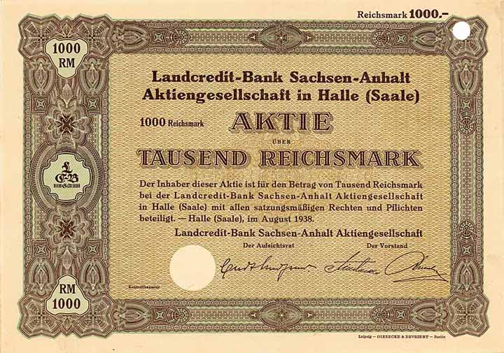 | Vorheriges Los | Zurück | Nächstes Los | | Losnr.: | 337 (Deutschland) | | Titel: | Landcredit-Bank Sachsen-Anhalt AG | | Auflistung: | Aktie 1.000 RM Aug. 1938 (Blankette, R 10). | | Ausruf: | 40,00 EUR | Ausgabe- datum: | 01.08.1938 | Ausgabe- ort: | Halle a.S. | | Abbildung: |  | | Info: | Gründung 1922. Filialen in Stendal, Heiligenstadt, Beetzendorf, Magdeburg, Salzwedel und Eisleben. | | Besonder-heiten: | Lochentwertet (RB). | | Verfügbar: | Nur fünf dieser Blanketten wurden im Reichsbankschatz gefunden. (R 10) | | Erhaltung: | EF+. | | Zuschlag: | offen |