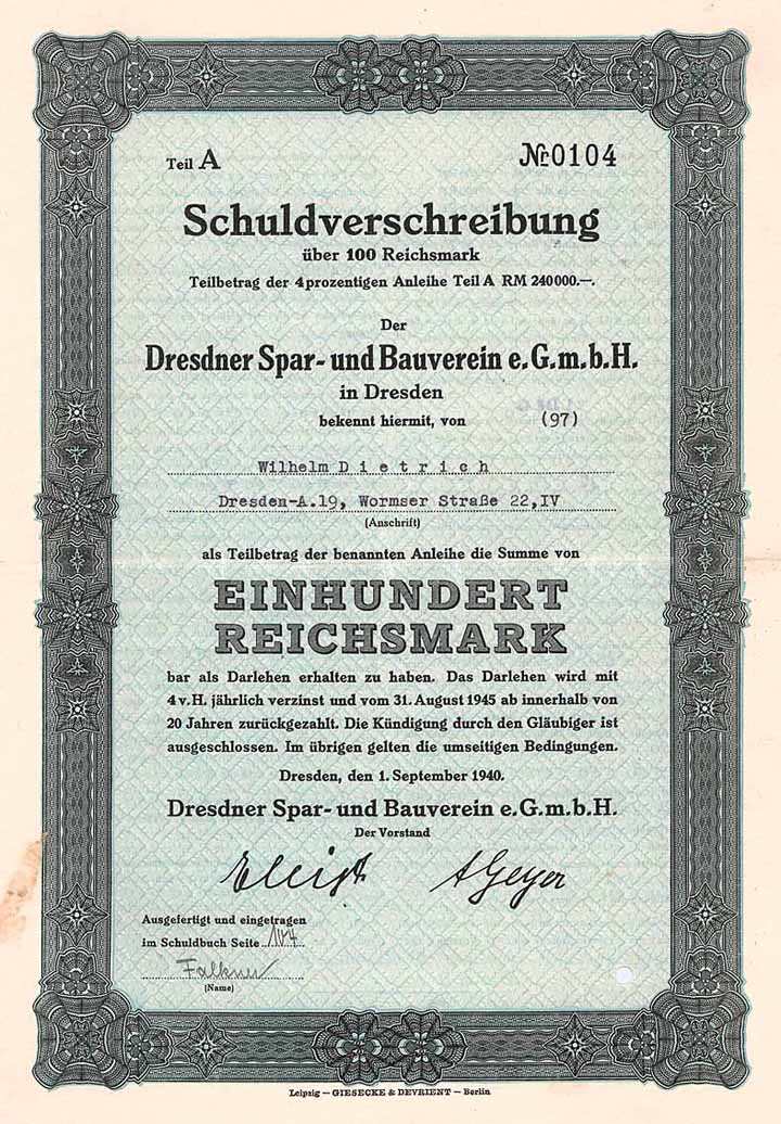 | Vorheriges Los | Zurück | Nächstes Los | | Losnr.: | 171 (Deutschland) | | Titel: | Dresdner Spar- und Bauverein eGmbH | | Auflistung: | 4 % Namens-Schuldv. 100 RM 1.9.1940 (Auflage 700, R 9). | | Ausruf: | 38,00 EUR | Ausgabe- datum: | 01.09.1940 | Ausgabe- ort: | Dresden | | Abbildung: |  | | Stücknr.: | 103 | | Info: | Die älteste Baugenossenschaft in Dresden, gegründet schon 1898. Zunächst wurden 7 Doppelhäuser in Kaditz vom in Liquidation gegangenen Bauverein für Arbeiterwohnungen übernommen. Bis zum Beginn des 2. Weltkrieges wurden an 22 Standorten fast 3.000 Wohnungen errichtet, womit die Genossenschaft zu den vier größten Wohnungsunternehmen in Dresden zählte. Aufgegangen nach 1945 zunächst in der Dresdner Wohnungsbaugenossenschaft und 1976 in der Groß-AWG Aufbau Dresden. Heute Wohnungsgenossenschaft Aufbau Dresden eG. | | Besonder-heiten: | Lochentwertet (RB). | | Verfügbar: | Nur 9 Stück lagen im Reichsbankschatz. Doppelblatt. (R 9) | | Erhaltung: | EF- | | Zuschlag: | 38,00 EUR |