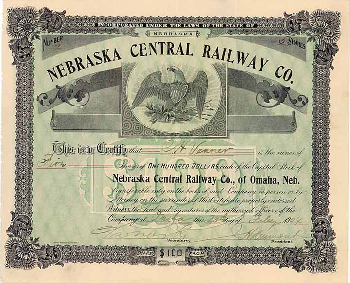 | Vorheriges Los | Zurück | Nächstes Los | | Losnr.: | 1239 (USA) | | Titel: | Nebraska Central Railway | | Auflistung: | 5 shares à 100 $ 23.2.1904. | | Ausruf: | 120,00 EUR | Ausgabe- datum: | 23.07.1904 | Ausgabe- ort: | Omaha, Neb. | | Abbildung: |  | | Stücknr.: | 2 | | Info: | Reine Zweckges. der mächtigen Chicago, Burlington & Quincy zum Bau einer Seitenlinie, die von ihrer nach Westen durch Nebraska führenden Hauptstrecke bei Aurora abzweigte. | | Verfügbar: | Unentwertet. Nur 7 dieser sog. “directors shares” wurden überhaupt jemals ausgegeben. | | Erhaltung: | EF-VF. | | Zuschlag: | 135,00 EUR |