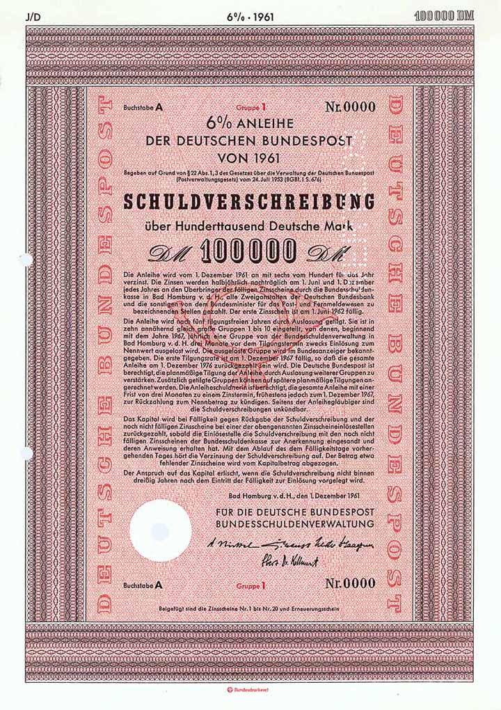 | Vorheriges Los | Zurück | Nächstes Los | | Losnr.: | 878 (Deutschland nach 1945) | | Titel: | Deutsche Bundespost | | Auflistung: | 6 % Schuldv. 100.000 DM 1.12.1961 (nullgeziffertes Muster, R 10). | | Ausruf: | 60,00 EUR | Ausgabe- datum: | 01.12.1961 | Ausgabe- ort: | Bad Homburg v.d.H. | | Abbildung: |  | | Info: | Nachfolgerin der Deutschen Reichspost, die mit der Reichsgründung 1871 aus der 1868 entstandenen Norddeutschen Bundespost entstanden war. Zunächst ein reichs- bzw. später bundesunmittelbares Unternehmen, mit der Postreform 1989 aufgeteilt in die eigenständigen Unternehmensbereiche DBP Postbank, DBP Postdienst und DBP Telekom, die später privatisiert und jeder für sich als Aktiengesellschaft an die Börse gebracht wurden. | | Besonder-heiten: | Mit Posthorn im Unterdruck. | | Verfügbar: | Abheftlochung, lochentwertet. Mit kpl. Kuponbogen. Rarität aus einem Archiv. (R 10) | | Erhaltung: | EF | | Zuschlag: | offen |