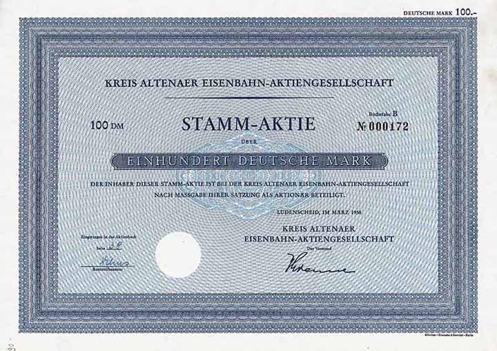 | Vorheriges Los | Zurück | Nächstes Los | | Losnr.: | 955 (Deutschland nach 1945) | | Titel: | Kreis Altenaer Eisenbahn-AG | | Auflistung: | Aktie Lit. B 100 DM März 1958 (Auflage 525, R 8). | | Ausruf: | 40,00 EUR | Ausgabe- datum: | 01.03.1958 | Ausgabe- ort: | Lüdenscheid | | Abbildung: |  | | Stücknr.: | 399 | | Info: | Gründung 1886 in Altena, ab 1905 in Lüdenscheid ansässig. Erste Strecke Altena-Lüdenscheid (14,5 km Schmalspur). Bis 1905 wuchs das Streckennetz im Kreis Lüdenscheid auf 41 km an, dazu kamen folgende Strecken: Lüdenscheid-Augustenthal-Werdohl; Schalksmühle-Halver; Verbindung Lüdenscheid zum DR-Bahnhof. 1953 Vergleichsverfahren. Strecken von 1949 bis 1967 bis auf 700 m Restgleis sukzessive stillgelegt. 1976 Umfirmierung in Märkische Eisenbahngesellschaft. | | Verfügbar: | Rückseitig entwertet. (R 8) | | Erhaltung: | EF | | Zuschlag: | 40,00 EUR n |