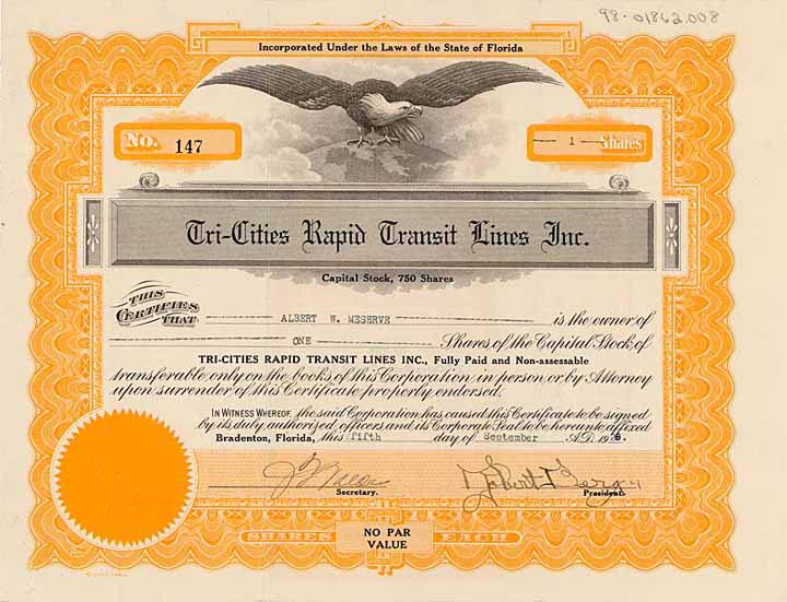 | Vorheriges Los | Zurück | Nächstes Los | | Losnr.: | 1297 (USA) | | Titel: | Tri-Cities Rapid Transit Lines Inc. | | Auflistung: | 1 share o.N. 5.9.1926. | | Ausruf: | 50,00 EUR | Ausgabe- datum: | 05.09.1926 | Ausgabe- ort: | Bradenton, Florida | | Abbildung: |  | | Stücknr.: | 147 | | Info: | Gründung am 9.11.1925. Bradenton ist eine Stadt im Manatee County in Florida, gelegen an der südlichen Meeres-Einfahrt zur Tampa Bay. | | Besonder-heiten: | Orange/schwarzer Druck mit Adlervignette. | | Verfügbar: | Unentwertet. | | Erhaltung: | VF+ | | Zuschlag: | offen |