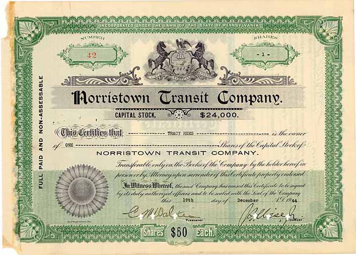 | Vorheriges Los | Zurück | Nächstes Los | | Losnr.: | 1166 (USA) | | Titel: | Morristown Transit Co. | | Auflistung: | 1 share à 50 $ 19.12.1944. | | Ausruf: | 30,00 EUR | Ausgabe- datum: | 19.12.1944 | | Abbildung: |  | | Stücknr.: | 42 | | Besonder-heiten: | Grün/schwarzer Druck. Stahlstich mit Wappenschild, Adler und 2 steigenden Pferden und dem Ausspruch „Virtue Liberty And Indpendence“. | | Verfügbar: | 2 kleine Papierabrisse am linken Rand, dort auch schwache Leimspur vom Stub. | | Erhaltung: | EF-VF | | Zuschlag: | offen |