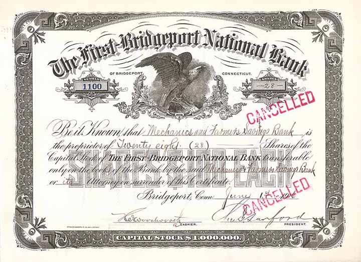 | Vorheriges Los | Zurück | Nächstes Los | | Losnr.: | 1080 (USA) | | Titel: | First-Bridgeport National Bank | | Auflistung: | 2 shares à 100 $ 14.10.1915. | | Ausruf: | 30,00 EUR | Ausgabe- datum: | 01.06.1916 | Ausgabe- ort: | Bridgeport, Conn. | | Abbildung: |  | | Stücknr.: | 1061 | | Info: | Gründung 1909 nach Verschmelzung der bereits 1806 gegründeten bedeutenden Bridgeport National Bank mit der First National Bank zu First Bridgeport Nationalbank, 1921 nach Übernahme der Connecticut National Bank umbenannt in First National Bank of Bridgeport, 1929 umorganisiert zu First National Bank & Trust Co. of Bridgeport. Tochtergesellschaft der Bridgeport Financial Corp. mit Filialen in Bridgeport, Boyd und Decatur in Connecticut, 2005 übernommen von der First Financial Bankshares (Nasdaq: FFIN). | | Besonder-heiten: | Sehr schöne Adler-Vignette. | | Erhaltung: | EF-VF | | Zuschlag: | offen |