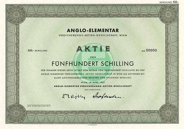 | Vorheriges Los | Zurück | Nächstes Los | | Losnr.: | 876 (10 Euro Ausruf – Sammlung Österreich) | | Titel: | Anglo-Elementar Versicherungs-AG | | Auflistung: | Aktie 500 S März 1967 (nullgeziffertes Muster). | | Ausruf: | 10,00 EUR | Ausgabe- datum: | 01.03.1967 | Ausgabe- ort: | Wien | | Abbildung: |  | | Info: | Gründung 1898 zum Zwecke, dem 1896 gegründeten Versicherungsverband österr. und ung. Industrieller Rückendeckung zu gewähren. 1901 wurde die Transportversicherung, 1902 und 1903 die Unfall- und Haftpflicht und 1909 die Versicherung gegen Einbruchdiebstahl und die Versicherung von Renn-, Luxus- und höherwertigen Pferden aufgenommen. Ab 1921 Anglo-Elementar-Versicherungs-AG, ab 1939 Allgemeine Elementar Versicherungs-AG, seit 1946 wie vorher. 1997 endgültige Eingliederung in den Allianz-Konzern (Allianz Elementar Versicherungs-AG, Wien). | | Verfügbar: | „Ungültig“ perforiert (Oldenbourg). | | Erhaltung: | UNC-EF | | Zuschlag: | 20,00 EUR |