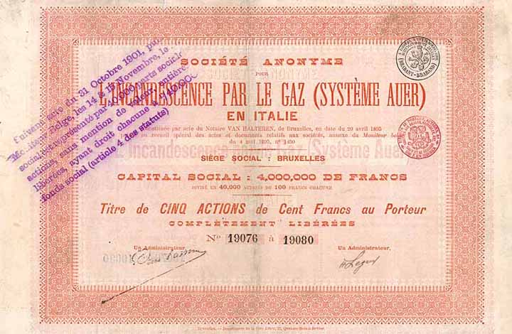 | Vorheriges Los | Zurück | Nächstes Los | | Losnr.: | 7 (Belgien) | | Titel: | S.A. l'Incandescence par le Gaz (Systeme Auer) en Italie | | Auflistung: | Actions 5 x 100 Francs 4.5.1895. | | Ausruf: | 25,00 EUR | Ausgabe- datum: | 04.05.1895 | Ausgabe- ort: | Brüssel | | Abbildung: |  | | Stücknr.: | 19076-80 | | Info: | Um 1826 kam die Gasbeleuchtung auf. 1886 erfand der österreichische Chemiker und Ingenieur Auer von Welsbach das Gasglühlicht. 1892 wurde die Deutsche Gasglühlicht AG (Degea, DGA) in Berlin gegründet. Die 1895 gegründete Ges. finanzierte mit belgischem Kapital die Gasbeleuchtung für Italien. | | Erhaltung: | VF+ | | Zuschlag: | offen |