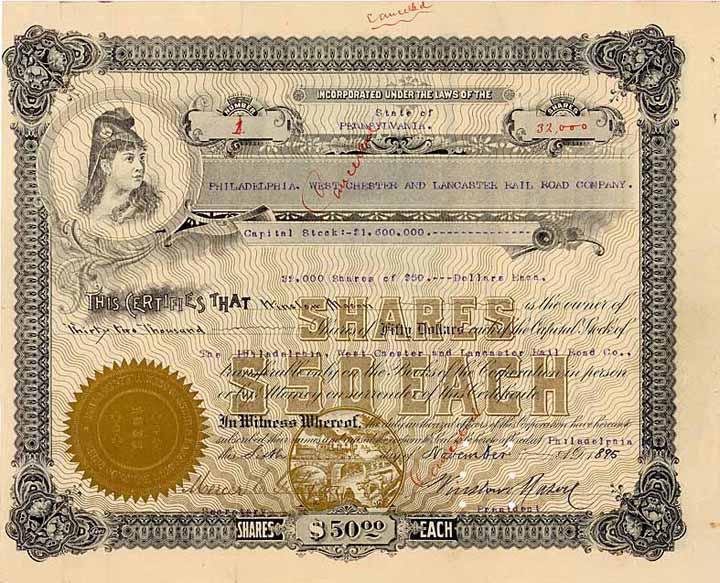 | Vorheriges Los | Zurück | Nächstes Los | | Losnr.: | 1218 (USA) | | Titel: | Philadelphia, West Chester & Lancaster Railroad | | Auflistung: | 32.000 shares à 50 $ 6.11.1895 (R 12), ausgestellt auf und als president original unterschrieben von Winslow Mason. | | Ausruf: | 180,00 EUR | Ausgabe- datum: | 06.11.1895 | Ausgabe- ort: | Philadelphia, Pa. | | Abbildung: |  | | Stücknr.: | 1 | | Info: | Gegründet 1895 als Konkurrenz zur bereits seit 1858 in Betrieb befindlichen West Chester & Philadelphia RR (die Ende des 19 Jh. zum Konzern der Philadelphia & Baltimore Central RR und später zur PRR gehörte). | | Besonder-heiten: | Maschinenschriftliche Ausführung auf schwarz/goldenem Standard-Vordruck. | | Verfügbar: | Ein ganz garantiert einmaliges Stück, denn dieses No.-1-Zertifikat verbriefte 100 % des Aktienkapitals. (R 12) | | Erhaltung: | VF | | Zuschlag: | 220,00 EUR |