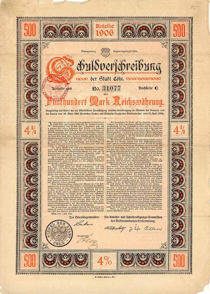| Vorheriges Los | Zurück | Nächstes Los | | Losnr.: | 442 (Deutschland) | | Titel: | Stadt Cöln | | Auflistung: | 4 % Schuldv. 500 Mark 1.7.1906 (R 10). | | Ausruf: | 25,00 EUR | Ausgabe- datum: | 01.07.1906 | Ausgabe- ort: | Köln | | Abbildung: |  | | Stücknr.: | 31077 | | Besonder-heiten: | Teil einer Anleihe von insgesamt 36 Mio. Mark zwecks Herstellung von Hafenanlagen, Neubauten für die Handelshochschule, die zweite höhere Mädchenschule und das Realgymnasium, zur Errichtung eines Gebäudes für die Meisterkurse, verbunden mit dem Bau einer Gewerbehalle sowie einer Kunstgewerbeschule, zum Durchbruch der Schildergasse nach dem Heumarkt, zur Neuanlage und zum Umbau von Kleinbahnen, zur Erweiterung der städtischen Gas-, Elektrizitäts- und Wasserwerke, zur Beschaffung eines Bauplatzes für den Neubau des ethnographischen Rautenstrauch-Joest-Museums und zur inneren Einrichtung des Museums etc. | | Verfügbar: | Unentwertet, mit Kupons ab 1925. (R 10) | | Erhaltung: | VF- | | Zuschlag: | 65,00 EUR |