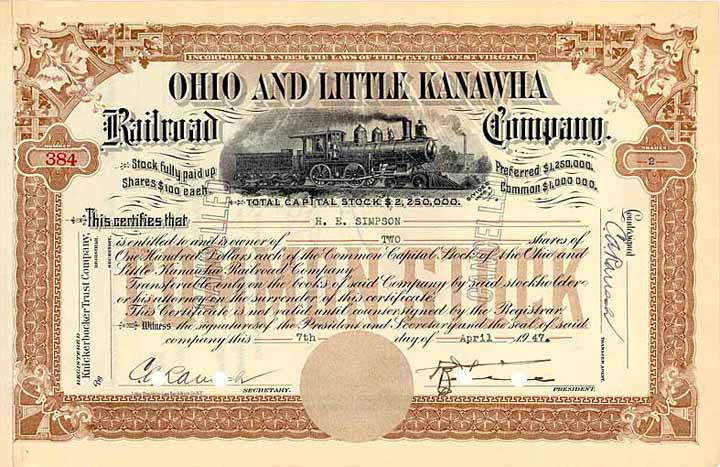 | Vorheriges Los | Zurück | Nächstes Los | | Losnr.: | 1197 (USA) | | Titel: | Ohio & Little Kanawha Railroad | | Auflistung: | 2 shares à 100 $ 7.4.1947. | | Ausruf: | 30,00 EUR | Ausgabe- datum: | 07.04.1947 | Ausgabe- ort: | Newark, O. / W. Virginia | | Abbildung: |  | | Stücknr.: | 384 | | Info: | Ursprünglich gegründet 1883 als Zanesville, McConnellsville & Pomeroy Ry., dann erst die Chicago, Zanesville & Atlantic Ry. und später die Zanesville & Ohio River Ry., 1900 schließlich unter obiger Bezeichnung reorganisiert. 72 Meilen lange Strecke im Staat Ohio von Fair Oaks (Zanesville) nach West Marietta. Alleinaktionär war die Baltimore & Ohio. | | Besonder-heiten: | Braun/schwarzer Druck mit eindrucksvoller Dampflok-Vignette. | | Verfügbar: | Stücke dieser Bahn waren bei uns noch nie angeboten. | | Erhaltung: | EF-VF | | Zuschlag: | offen |