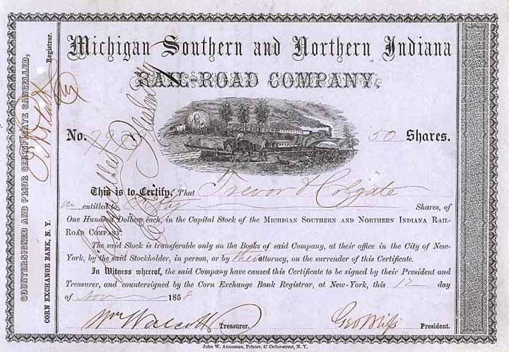 | Vorheriges Los | Zurück | Nächstes Los | | Losnr.: | 1064 (10 Euro Ausruf – Sammlung Eisenbahnen weltweit) | | Titel: | Michigan Southern & Northern Indiana Railroad | | Auflistung: | 10 shares à 100 $ 3.11.1858. | | Ausruf: | 10,00 EUR | Ausgabe- datum: | 12.11.1858 | Ausgabe- ort: | New York | | Abbildung: |  | | Stücknr.: | 7865 | | Info: | Die ersten unter den mehr als einem Dutzend Vorgängern waren 1833 die Erie & Kalamazoo RR in Michigan und 1835 die Buffalo & Mississippi RR in Indiana (1837 in Northern Indiana RR umbenannt). 1851 wurde die Northern Indiana RR auch in Ohio konzessioniert. 1855 unter obigem Namen mit der Michigan Southern verschmolzen. Die Hauptstrecke von Toledo, O. nach Chicago, Ill. war 243 Meilen lang. 1869 mit der Lake Shore & Michigan Southern RR fusioniert, 1914 in der New York Central aufgegangen. Noch heute eine der wichtigsten Bahnstrecken an den Großen Seen. 1998 wurde das Eigentum aufgeteilt: Die Strecke östlich von Cleveland gehört heute CSX, der Teil westlich von Cleveland der Norfolk Southern. | | Besonder-heiten: | Gedruckt auf hellblauem Papier, schöne Holzstich-Vignette mit Eisenbahn, Farmern und Treidelkahn. | | Erhaltung: | EF-VF | | Zuschlag: | 35,00 EUR |