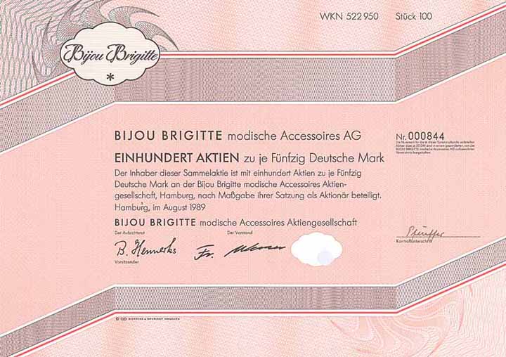 | Vorheriges Los | Zurück | Nächstes Los | | Losnr.: | 178 (Deutschland nach 1945) | | Titel: | Bijou Brigitte modische Accessoires AG | | Auflistung: | Sammelaktie 100 x 50 DM Aug. 1989 (Auflage NUR 100 STÜCK, R 6). | | Ausruf: | 45,00 EUR | Ausgabe- datum: | 01.08.1989 | Ausgabe- ort: | Hamburg | | Abbildung: |  | | Stücknr.: | 895 | | Info: | Gründung 1963 in Hamburg durch Friedrich Werner als Handelsunternehmen für Modeschmuck mit Im- und Export. 1971 umbenannt in “Bijou Brigitte Inh. Friedrich Werner” Ab 1977 Aufbau eines eigenen Filialnetzes. 1987 Umwandlung in eine AG, 1988 in Hamburg an die Börse gegangen. 1989 Eröffnung der ersten Auslandsfilialen in Österreich und den Niederlanden, es folgten Hongkong, Spanien, Polen, Ungarn, Portugal, Italien, Tschechische Republik, Frankreich, Griechenland und USA. Mit einer Ladenpräsenz in nahezu jeder größeren deutschen Innenstadt und einem hochprofitablen Jahresumsatz von 366 Mio. € eine der wenigen Erfolgsstorys im deutschen Einzelhandel. | | Verfügbar: | Lochentwertet. (R 6) | | Erhaltung: | EF | | Zuschlag: | 50,00 EUR |