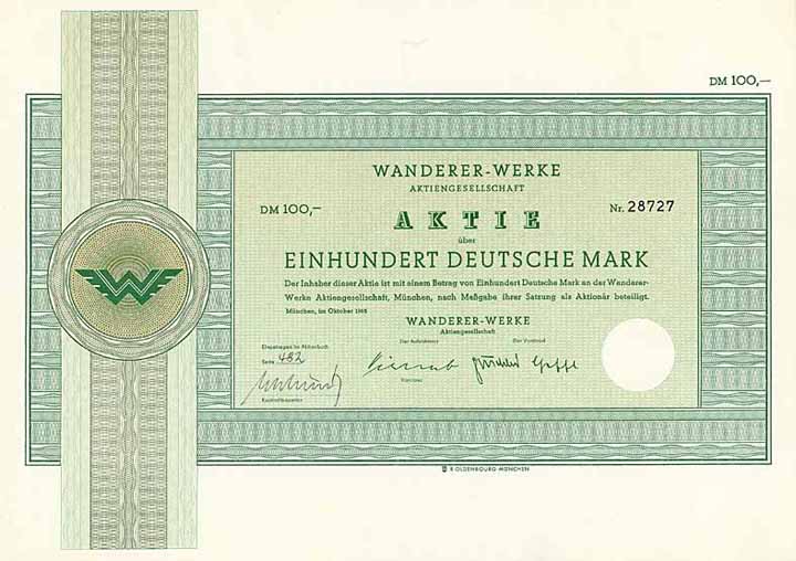 | Vorheriges Los | Zurück | Nächstes Los | | Losnr.: | 796 (Deutschland nach 1945) | | Titel: | Wanderer-Werke AG | | Auflistung: | Aktie 100 DM Okt. 1965 (Auflage 7000, R 8). | | Ausruf: | 30,00 EUR | Ausgabe- datum: | 01.10.1965 | Ausgabe- ort: | München | | Abbildung: |  | | Stücknr.: | 31910 | | Info: | Gründung 1885 als "Chemnitzer Velocipedfabrik Winklhofer & Jaenicke", seit 1896 "Wanderer Fahrradwerke AG". Bereits 1890 wurde der zunächst nur für den eigenen Bedarf betriebene Werkzeugmaschinenbau (vor allem Fräsmaschinen) ein eigener Fabrikationszweig. Ab 1902 auch Bau von Motorrädern, 1904 Produktionsbeginn der legendären Continental Schreib-, Rechen- und Buchungsmaschinen. Der 1912 aufgenommene Kraftfahrzeugbau wurde 1932 in die neu gegründete Auto Union AG eingebracht (gemeinsam mit Zschopauer Motorenwerke, Audi und Horch). Nach der 1948 erfolgten Enteignung der sächsischen Betriebsstätten Sitzverlegung nach München, 1950 kamen die ersten Konsol-Fräsmaschinen und Fahrräder aus westdeutscher Fertigung auf den Markt. Die Büromaschinenfertigung wurde 1951 bei der „Exacta-Continental Büromaschinenwerk GmbH“ in Köln-Deutz konzentriert (1968 an Heinz Nixdorf verkauft, damit der Ursprung der späteren Nixdorf Computer AG). 1952 Eröffnung eines neuen Werkzeugmaschinen-Werkes in Haar bei München (1981 auf die Wanderer Maschinen GmbH übertragen und an UTI Industries verkauft). 1957 Aufgabe des unter Absatzschwächen leidenden Zweiradgeschäftes. 1985 Beteiligung an der 1950 gegründeten Böwe Maschinenfabrik GmbH in Augsburg (Reinigungstechnik, Wäschereimaschinen, Büroautomaten, Informations- und Systemtechnik), die sich später auf Kuvertiersysteme konzentrierte, damit Weltmarktführer wurde und 1992 als Böwe Systec AG an die Börse ging. Die 2003/05 erfolgte Übernahme des US-amerikanischen Konkurrenten Bell & Howell erwies sich als Fehlkauf, der Böwe 2010 in die Insolvenz führte. Mit dem Untergang ihrer Hauptbeteiligung brach dann auch die überwiegend kreditfinanzierte Wanderer-Werke AG zusammen. | | Verfügbar: | Mit restlichen Kupons. Leichte Knickfalte. Relativ selten. (R 2) | | Erhaltung: | EF- | | Zuschlag: | 30,00 EUR |