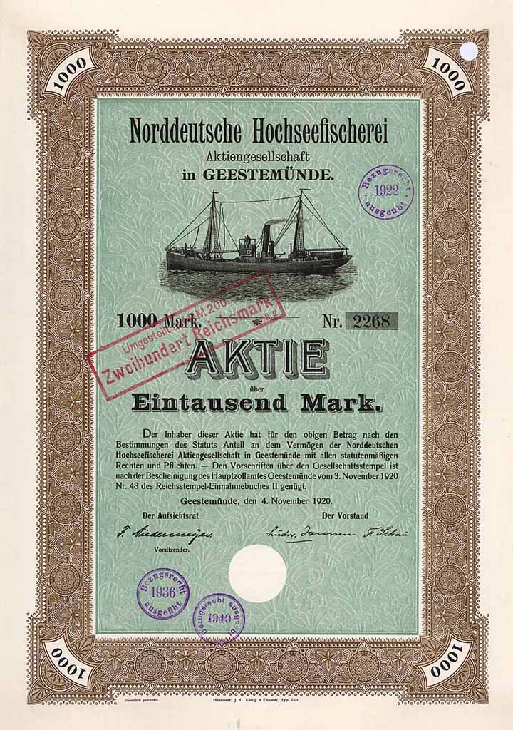 | Vorheriges Los | Zurück | Nächstes Los | | Losnr.: | 157 (Deutschland) | | Titel: | Norddeutsche Hochseefischerei AG | | Auflistung: | Aktie 1.000 Mark 4.11.1920 (Auflage 1450, R 7). | | Ausruf: | 55,00 EUR | Ausgabe- datum: | 04.11.1920 | Ausgabe- ort: | Geestemünde | | Abbildung: |  | | Stücknr.: | 2258 | | Info: | Gründung 1907. 1935 Übernahme der Deutsche Fischerei AG. Die Fangflotte erreichte bis zum Kriegsbeginn 23 Schiffe. 1968 Übernahme der Bremen-Vegesacker Fischerei GmbH. 1970 Vercharterung der gesamten Flotte (15 Schiffe) an die Nordsee Deutsche Hochseefischerei GmbH. 1977 Rückzug aus dem Fischfanggeschäft. 1979 Umfirmierung in Project Carries AG und Sitzverlegung von Bremerhaven nach Leer/Ostfriesland. Seitdem Wahrnehmung von Geschäftsführungsaufgaben als Komplementär für Reedereien des neuen Schiffstyps Project Carrier. 1982 Sitzverlegung nach Bad Schwartau. 1985 Umbenennung in Hansa-Linie AG und Sitzverlegung nach Bremen, 1989 Umbenennung in MAMMOET-HANSA-Linie AG, 1994 Sitzverlegung nach Rostock, seit 1995 als Reederei Hansa AG und seit 2007 als INTERHANSA Reederei AG firmierend. Eigene Umsätze erzielt die AG nicht mehr, wesentliches Aktivum waren bis zum Verkauf 2008/2009 Beteiligungen an der Hugo Stinnes Linien GmbH (100 %, Liniendienste nach Mexico und Südafrika) und der Deutsche SeeHansa AG (50 %, Emissionshaus für Schiffsbeteiligungen gemeinsam mit Salomon Brothers). Für die ganz wenigen übrig gebliebenen Kleinaktionäre ließ der zypriotische Großaktionär 2008 einen squeeze-out beschließen. | | Besonder-heiten: | Dekorativ, mit großer Abb. eines Heringsloggers. Lochentwertet (RB). | | Verfügbar: | Doppelblatt. (R 7) | | Erhaltung: | EF | | Zuschlag: | 85,00 EUR |