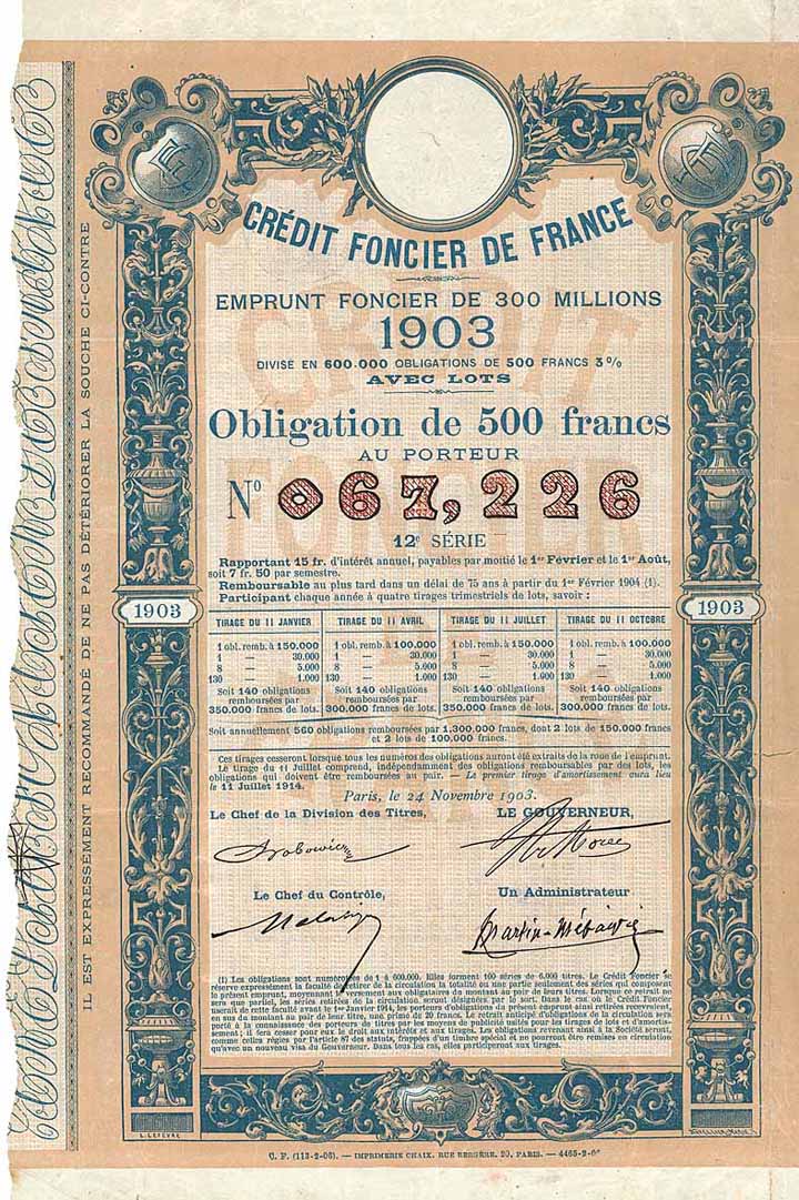 | Vorheriges Los | Zurück | Nächstes Los | | Losnr.: | 812 (Frankreich) | | Titel: | Crédit Foncier de France | | Auflistung: | 3 % Obl. 500 F 24.11.1903. | | Ausruf: | 10,00 EUR | Ausgabe- datum: | 24.11.1903 | Ausgabe- ort: | Paris | | Abbildung: |  | | Stücknr.: | 67226 | | Info: | Bereits 1852 gegründete Bank. | | Verfügbar: | Kupons anhängend. | | Erhaltung: | VF | | Zuschlag: | offen |