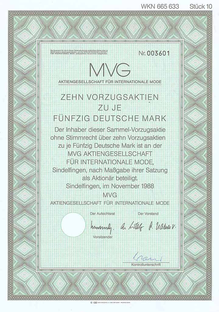 | Vorheriges Los | Zurück | Nächstes Los | | Losnr.: | 718 (Deutschland nach 1945) | | Titel: | MVG AG für internationale Mode | | Auflistung: | Sammel-VZ-Aktie 10 x 50 DM Nov. 1988 (Auflage 9000, R 7). | | Ausruf: | 30,00 EUR | Ausgabe- datum: | 01.11.1988 | Ausgabe- ort: | Sindelfingen | | Abbildung: |  | | Stücknr.: | 1503 | | Info: | Auf junge, sportliche Damenoberbekleidung war die 1975 gegründete Kierst + Detmer oHG spezialisiert. 1980 gegründet: Die MAYON Strick- und Sportswear Design GmbH (anspruchsvolle Damenstrickwaren) und die AWT Achim Walz Textil GmbH (junge Damenmode). Diese drei Firmen wurden 1988 zur MVG verschmolzen, die sodann mit Vorzugsaktien an die Börse ging. Lange ging die Sache nicht gut: 1992 Anschlußkonkurs. | | Verfügbar: | Mit Kupons. Unentwertet. (R 7) | | Erhaltung: | UNC | | Zuschlag: | offen |