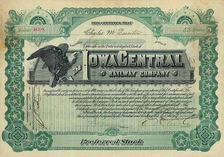 | Vorheriges Los | Zurück | Nächstes Los | | Losnr.: | 1158 (USA) | | Titel: | Iowa Central Railway | | Auflistung: | 63 pref. shares à 100 $ 23.1.1903. | | Ausruf: | 400,00 EUR | Ausgabe- datum: | 23.01.1903 | | Abbildung: |  | | Stücknr.: | 4608 | | Info: | Gegründet 1888 zur Übernahme der zwangsversteigerten Central Iowa Railway. Diese war 1879 konzessioniert worden zwecks Reorganisation der 1869 gegründeten, 1871 fertiggestellten und 1873 pleite gegangenen Central Rail Road Co. of Iowa (die ein Projekt der zuvorigen Iowa River Ry. verwirklicht hatte). Hauptstrecke Albia-Manly Junc., Ia. (189 Meilen) sowie sechs Flügelbahnen mit zus. 223 Meilen Länge. Deren größte war die 97 Meilen lange Keithsburg Branch von Oskaloosa an das Westufer des Mississippi River. 1883 wurde daran anschließend auch die Peoria & Farmington RR erworben mit ihrer gerade fertiggestellten Strecke Peoria-Keithsburg (92 Meilen). Die Iowa Central wurde 1912 von der Minneapolis & St. Louis RR „geschluckt“. Diese wurde 1944 als „Railway“ reorganisiert und selbst 1960 von der mächtigen Chicago & Northwestern übernommen. | | Besonder-heiten: | Toller grün/schwarzer Stahlstich mit Vignette Weißkopfseeadler. | | Verfügbar: | Unentwertet. | | Erhaltung: | VF | | Zuschlag: | offen |