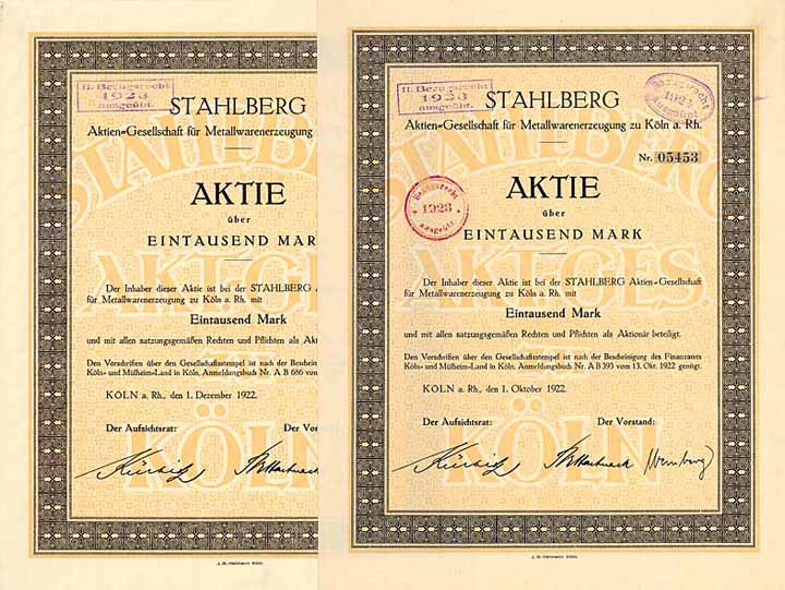 | Vorheriges Los | Zurück | Nächstes Los | | Losnr.: | 367 (Deutschland) | | Titel: | STAHLBERG AG für Metallwarenerzeugung (2 Stücke) | | Auflistung: | 2 Stücke Aktie 1.000 Mark 1.10.1922 (Auflage 8000, R 8). | | Ausruf: | 50,00 EUR | Ausgabe- datum: | 01.10.1922 | Ausgabe- ort: | Köln | | Abbildung: |  | | Stücknr.: | 5453+28909 | | Info: | Gründung 1921 zwecks Herstellung von Aluminiumwaren, elektrotechnischen Artikeln und Metall-Galanterie-Waren. 1921/22 Übernahme mehrerer Metallwarenfirmen und der „Helios“ Fabrik elektrotechnischer Bedarfsartikel in Lüdenscheid, 1922 Erwerb der Gummiwarenfabrik Paffrath, Köln. 1924 Konkurs. | | Erhaltung: | EF | | Zuschlag: | offen |