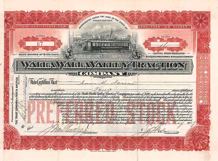 | Vorheriges Los | Zurück | Nächstes Los | | Losnr.: | 969 (Sammlung „Historische Wertpapiere aus aller Welt") | | Titel: | Walla Walla Valley Traction Co. | | Auflistung: | 4 pref. shares à 100 $ 29.5.1907. | | Ausruf: | 10,00 EUR | Ausgabe- datum: | 29.05.1907 | Ausgabe- ort: | Washington | | Abbildung: |  | | Stücknr.: | B13 | | Info: | Gegründet 1905 zum Bau der 8 Meilen langen Straßenbahn in Walla Walla (einer Station an einer Nebenlinie der Northern Pacific ganz im Südosten des Staates Washington) sowie der 14 Meilen langen Überlandstraßenbahn nach Milton, Oregon. Die Bahnen sowie die beiden firmeneigenen Kraftwerke waren an die Northwestern Gas & Electric Co. verpachtet. | | Besonder-heiten: | Rostrot/schwarzer Stahlstich, Vignette mit elektrischer Überland-Straßenbahn. | | Verfügbar: | Mit kpl. Stub. Der normale Startpreis wäre 100 Euro daher heute eine sehr günstige Einstiegs-Chance! | | Erhaltung: | EF-VF | | Zuschlag: | 80,00 EUR |