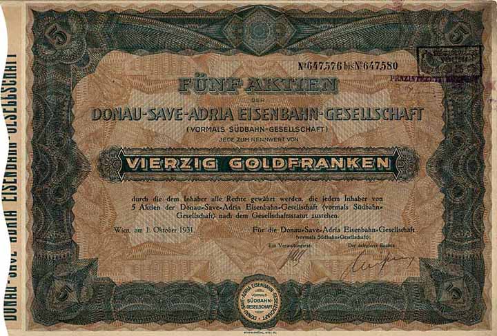 | Vorheriges Los | Zurück | Nächstes Los | | Losnr.: | 697 (Sammlung „Historische Wertpapiere aus aller Welt") | | Titel: | Donau-Save-Adria Eisenbahn-Gesellschaft (vormals Südbahn-Gesellschaft) | | Auflistung: | Aktie 5 x 40 Goldfranken 1.10.1931 (R 4). | | Ausruf: | 10,00 EUR | Ausgabe- datum: | 01.10.1931 | Ausgabe- ort: | Wien | | Abbildung: |  | | Stücknr.: | 672736-40 | | Info: | Gründung 1858 als “k.k.priv. Südliche Staats-, Lombardisch-Venetianische und Central-Italienische Eisenbahn-Gesellschaft”. An eigenen Linien besaß die Gesellschaft zuletzt: in der Republik Österreich 638 km; im Königreich Serbien, Kroatien und Slovenien 530 km; im Königreich Ungarn 559 km; im Königreich Italien 457 km. In Anwendung der entsprechenden Artikel der Friedensverträge von Saint-Germain und Trianon einigten sich die Nachfolgestaaten nach dem Auseinanderbrechen der Donaumonarchie im Vertrag von Rom am 29.3.1923 über den Weiterbetrieb der Südbahn und eine Regelung für deren unbezahlte Vorkriegsschulden. | | Besonder-heiten: | Art-Deko-Gestaltung in kräftigen Braun- und Grüntönen. Lochentwertet (RB). | | Verfügbar: | Doppelblatt. (R 4) | | Erhaltung: | EF | | Zuschlag: | 17,00 EUR |