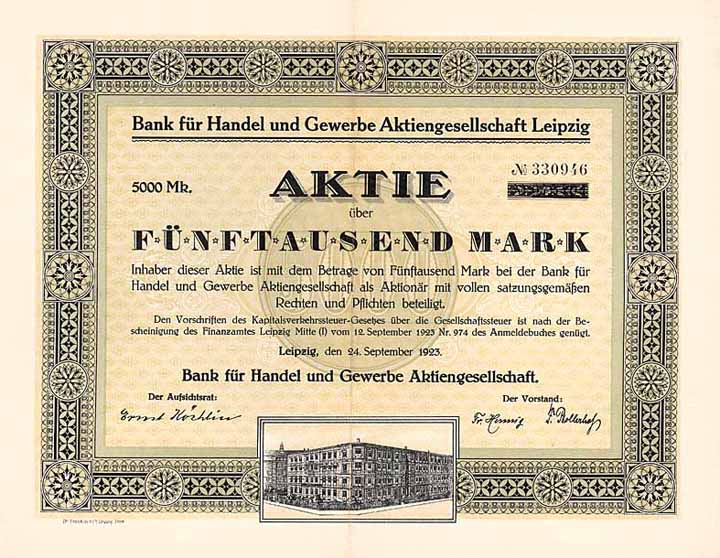 | Vorheriges Los | Zurück | Nächstes Los | | Losnr.: | 42 (Deutschland) | | Titel: | Bank für Handel und Gewerbe AG | | Auflistung: | Aktie 5.000 Mark 24.9.1923 (R 8). | | Ausruf: | 40,00 EUR | Ausgabe- datum: | 24.09.1923 | Ausgabe- ort: | Leipzig | | Abbildung: |  | | Stücknr.: | 279765 | | Info: | Gründung im März 1923. Bankgeschäfte insbesondere für Kreise des Mittelstandes. Die Hauptstelle der Bank befand sich am Johannisplatz. 1926 Einrichtung von 32 Spargelder-Annahmestellen in Leipziger Gaststätten. Ein spätes Opfer der Weltwirtschaftskrise: 1931 stellte die Bank ihre Zahlungen ein; ein Vergleich kam nicht zustande, deshalb ab 1932 in Liquidation. | | Besonder-heiten: | Dekorativ, mit Abb. des Bankgebäudes am Johannisplatz. | | Verfügbar: | Unentwertet, mit kpl. Kuponbogen. (R 8) | | Erhaltung: | EF- | | Zuschlag: | 40,00 EUR |