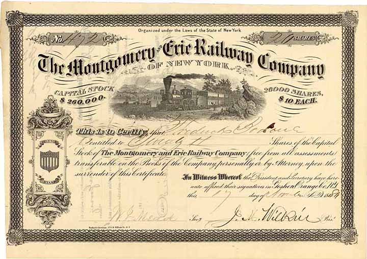 | Vorheriges Los | Zurück | Nächstes Los | | Losnr.: | 1120 (USA) | | Titel: | Montgomery & Erie Railway | | Auflistung: | 1 share à 10 $ 8.11.1866. | | Ausruf: | 45,00 EUR | Ausgabe- datum: | 02.02.1867 | Ausgabe- ort: | Goshen Orange County, New York | | Abbildung: |  | | Stücknr.: | 172 | | Info: | Gründung 1866. Die 10 Meilen lange Bahn war ursprünglich eine 6-Fuß-Breitspurbahn (ein Standard, der im Osten der USA zunächst von dutzenden von Bahnen verwendet wurde), 1880 auf Normalspur umgebaut. Seit 1872 an die New York, Lake Erie & Western RR verpachte, also zum Erie-RR-System gehörend. | | Besonder-heiten: | Hochwertig lithographierte Personenzug-Vignette. | | Verfügbar: | Unentwertet. Mit Steuermarke „25 c Washington“. | | Erhaltung: | VF+ | | Zuschlag: | 50,00 EUR |