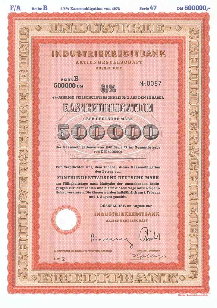 | Vorheriges Los | Zurück | Nächstes Los | | Losnr.: | 477 (Deutschland nach 1945) | | Titel: | Industriekreditbank AG | | Auflistung: | 6,5 % Kassenobl. 500.000 DM Aug. 1972 (Auflage NUR 30 STÜCK). | | Ausruf: | 30,00 EUR | Ausgabe- datum: | 01.08.1972 | Ausgabe- ort: | Düsseldorf | | Abbildung: |  | | Stücknr.: | 60 | | Info: | Gründung am 29.3.1949 als Industriekreditbank AG mit Sitz in Düsseldorf. 1974/75 Übernahme der Deutschen Industriebank durch Fusion zur Industriekreditbank AG Deutsche-Industriebank mit weiterem Sitz in Berlin. 1991 Umfirmierung in IKB Deutsche Industriebank AG. Die IKB ist das größte deutsche Spezialinstitut für lang- und mittelfristige Kredite an den Mittelstand; neuerdings hält die bundeseigene Kreditanstalt für Wiederaufbau ein größeres Aktienpaket. | | Verfügbar: | Lochentwertet. Rückseitig „Bedingungen für Kassenobligationen“. (R 9) | | Erhaltung: | EF+ | | Zuschlag: | 30,00 EUR |