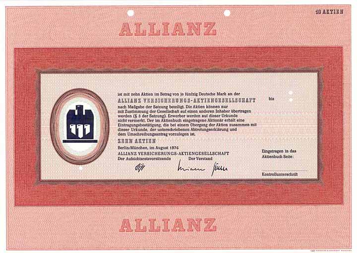 | Vorheriges Los | Zurück | Nächstes Los | | Losnr.: | 404 (Deutschland nach 1945) | | Titel: | Allianz Versicherungs-AG | | Auflistung: | Sammel-Namensaktie 10 x 50 DM Aug. 1976 (Muster, R 10). | | Ausruf: | 60,00 EUR | Ausgabe- datum: | 01.08.1976 | Ausgabe- ort: | Berlin/München | | Abbildung: |  | | Info: | Mit dem Gründungsjahr 1890 war die Allianz ein absoluter Nachzügler unter den deutschen Versicherungen. Doch durch Übernahme von Konkurrenzunternehmen fand man schnell Anschluss an die Spitze: Zum Konzern kam die Versicherungs-AG Fides in Berlin (1905), die Süddeutsche Feuerversicherungs-Bank (1906), der Bayerische Lloyd (1909) und die Kölnische Versicherungs-Bank (1920). 1921 war ein besonders expansives Jahr. Übernommen wurden 5 Versicherungen in Berlin, Karlsruhe und Hamburg, außerdem Gründung der "Kraft" Versicherungs-AG des Automobilclubs von Deutschland sowie Übernahme des deutschen Versicherungsbestandes der Schweiz. National-Versicherungs-Gesellschaft in Basel. 1922 Gründung der Allianz Lebensversicherungsbank. Weit nach vorn kam die Allianz 1923 durch den Erwerb der Aktien der "Bayer. Versicherungs-Bank AG" (vormals Versicherungs-Anstalten der Bayerischen Hypotheken- und Wechsel-Bank). 1927 Fusion mit der Stuttgarter Verein Versicherungs-AG, danach von 1927 bis 1940 Firmierung als "Allianz und Stuttgarter Verein Versicherungs-AG". 2006 Übernahme der italienischen RAS und gleichzeitige Umwandlung in eine Europäische AG (SE = lat. Societas Europaea). Dass übrigens Sitz der von Anfang an "urbayerischen" Gründung formell zuerst Berlin war, hatte einen praktischen Grund: So war der Allianz auch die Geschäftstätigkeit im höchst wichtigen Geschäftsgebiet Preußen erlaubt. | | Verfügbar: | Lochentwertet und Abheftlochung. Mit Kupons. (R 10) | | Erhaltung: | EF | | Zuschlag: | offen |