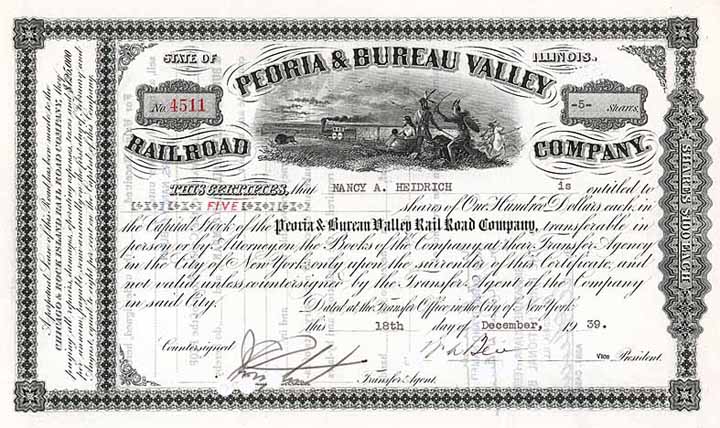| Vorheriges Los | Zurück | Nächstes Los | | Losnr.: | 1147 (USA) | | Titel: | Peoria & Bureau Valley Railroad | | Auflistung: | 5 shares à 100 $ 18.12.1939. | | Ausruf: | 35,00 EUR | Ausgabe- datum: | 18.12.1939 | Ausgabe- ort: | New York | | Abbildung: |  | | Stücknr.: | 4511 | | Info: | Wichtige Untergesellschaft der Chicago & Rock Island RR, die die Strecken Bureau Junction nach Peoria, Ill. (46 m) 1854 pachtete. | | Besonder-heiten: | Herrliche Vignette mit Güterzug in der weiten Prairie, im Vordergrund Bison, zu Fuß und zu Pferde jagende Indianer mit Speer sowie Pfeil und Bogen. | | Erhaltung: | EF | | Zuschlag: | 35,00 EUR |