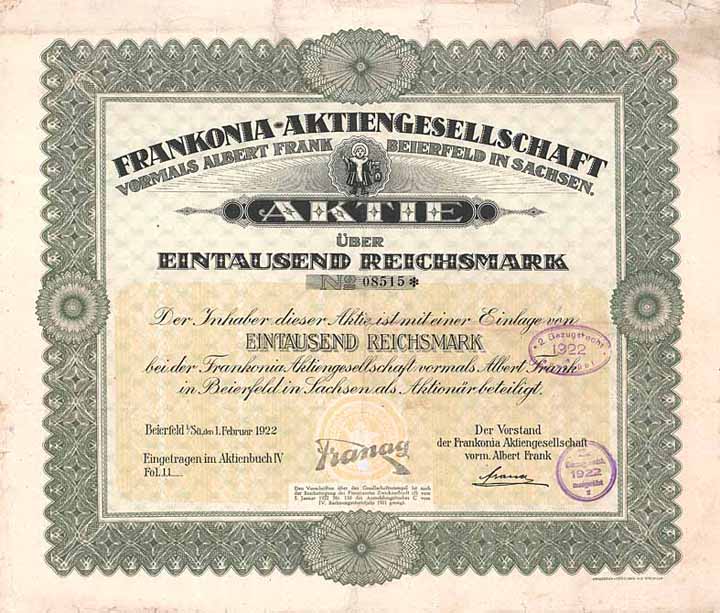 | Vorheriges Los | Zurück | Nächstes Los | | Losnr.: | 174 (Deutschland) | | Titel: | Frankonia AG vormals Albert Frank | | Auflistung: | Aktie 1.000 Mark 1.2.1922 (Auflage 16000, R 10). | | Ausruf: | 140,00 EUR | Ausgabe- datum: | 01.02.1922 | Ausgabe- ort: | Beierfeld i/Sa. | | Abbildung: |  | | Stücknr.: | 9324 | | Info: | Bei der Gründung 1914 zwecks Übernahme und Weiterführung der Firma Albert Frank und der Börseneinführung in Berlin wirkten die Berliner Bankhäuser Hardy & Co. GmbH und Delbrück Schickler & Co. sowie die Nationalbank für Deutschland mit. Hergestellt wurden Zubehör und Teile für Automobile und Fahrräder, speziell Automobillaternen. Beflügelt wurde die Phantasie beim Börsengang exakt zu Beginn des 1. Weltkrieges ganz offenbar von der Aussicht auf große Heeresaufträge. So erklärt sich auch die überaus hochkarätige Besetzung des Aufsichtsrates durch die Konsortialbanken mit den Berliner Bankiers Fritz Andreae, Dr. Hjalmar Schacht (dem späteren Präsidenten der Reichsbank), Dr. Gustav Ratjen und dem Barmer Privatbankier Theodor Hinsberg. Zu der Fabrik im sächsischen Beierfeld kamen dann noch Zweigbetriebe in Berlin-Adlershof (in unmittelbarer Nachbarschaft der Ford-Automobilwerke gelegen) und die Fa. Adolph H. Neufeldt im ostpreußischen Elbing. Nach anfänglicher Scheinblüte durch Rüstungsaufträge traf in den 1920er Jahren die Krise der Automobilindustrie als Hauptabnehmer die Frankonia AG um so härter. Anfang 1928 ging die AG in Liquidation. | | Besonder-heiten: | Großformatig, mit Firmensignet (Engel mit Laterne). Lochentwertet (RB). | | Verfügbar: | Zuvor ganz unbekannt gewesener Jahrgang, nur 3 Stück lagen im Reichsbankschatz. Unten mit stärkeren Randverletzungen, mittig in Ordnung. (R 10) | | Erhaltung: | VF-F | | Zuschlag: | offen |