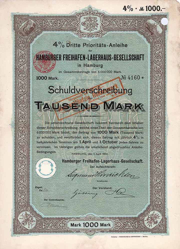 | Vorheriges Los | Zurück | Nächstes Los | | Losnr.: | 219 (Deutschland) | | Titel: | Hamburger Freihafen-Lagerhaus-Gesellschaft | | Auflistung: | 4 % Prior.-Obl. 1.000 Mark 1.4.1902 (Auflage 6000, R 8). | | Ausruf: | 150,00 EUR | Ausgabe- datum: | 01.04.1902 | Ausgabe- ort: | Hamburg | | Abbildung: |  | | Stücknr.: | 4159 | | Info: | Die Hamburger Freihafen-Lagerhaus-Ges. (HFLG) wurde am 7.3.1885 von Hamburger Kaufleuten und dem Senat gegründet, um im Zuge des Zollanschlusses an das Deutsche Reich das damals modernste und größte Logistikzentrum der Welt zu bauen - die Hamburger Speicherstadt. Der Bau der Speicherstadt dauerte von 1885 bis 1912. 1935 wurde die HFLG mit der seit 1865 bestehenden staatlichen Kaiverwaltung (Vereinigung staatlicher Kaibetriebe) zur Betriebsgesellschaft der hamburgischen Hafenanlagen fusioniert, die Umbenennung in Hamburger Hafen- und Lagerhaus-AG (HHLA) erfolgte 1939. Im Jahr 2005 umbenannt in Hamburger Hafen und Logistik AG (HHLA). Heute einer der führenden Hafenlogistik-Konzerne in Europa, dessen Geschäftstätigkeit untergliedert ist in die vier Segmente Container, Intermodal, Logistik und Immobilien. | | Besonder-heiten: | Anleihe von 6 Mio. M für die Fertigstellung der Gebäude auf dem zum Freihafengebiet bereits hinzugezogenen Teil der Wandrahmsinsel. Eine kleine, typisch Hamburgische Spezialität am Rande: Innerhalb vier Jahren nicht eingelöste Zinsscheine verfielen zu Gunsten der Beamten-Unterstützungskasse der Gesellschaft. Ein für die Hamburger Stadtgeschichte äußerst bedeutendes Stück. Dekorativ, Eckvignetten mit Güterzug und Segelschiff. Faksimile-Unterschrift von Siegmund Hinrichsen (1841-1902), Bankier in Firma Hardy & Hinrichsen, von 1872 bis 1879 Direktor der Norddeutschen Bank, Mitglied der Bürgerschaft von 1871 bis 1902, deren Präsident von 1892 bis 1902. Lochentwertet (RB). | | Verfügbar: | Randverletzungen fachgerecht restauriert. (R 8) | | Erhaltung: | VF | | Zuschlag: | 150,00 EUR |