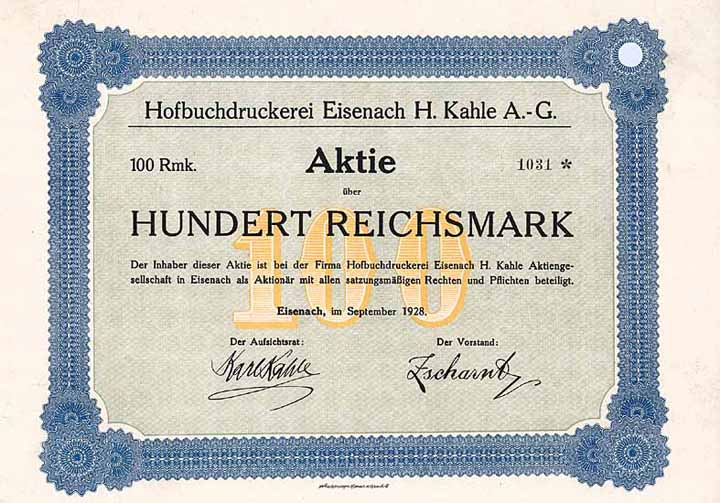 | Vorheriges Los | Zurück | Nächstes Los | | Losnr.: | 235 (Deutschland) | | Titel: | Hofbuchdruckerei Eisenach H. Kahle AG | | Auflistung: | Aktie 100 RM Sept. 1928 (Auflage 1200, R 8). | | Ausruf: | 75,00 EUR | Ausgabe- datum: | 01.09.1928 | Ausgabe- ort: | Eisenach | | Abbildung: |  | | Stücknr.: | 1028 | | Info: | Gründung 1923. Druckereibetrieb (u.a. auch Wertpapiere), Verlagsbuchhandel und Verlag von Zeitschriften, insbesondere der Eisenacher Zeitung. Nach Konkurseröffnung 1931 vom Konkursverwalter an die neugegründete Hofbuchdruckerei Eisenach H. Kahle GmbH unter Ausschluß der Aktiven und Passiven verkauft. Diese führte die AG in der alten Form weiter. | | Besonder-heiten: | Lochentwertet (RB). | | Verfügbar: | Nur 10 Stück lagen im Reichsbankschatz. (R 8) | | Erhaltung: | VF+ | | Zuschlag: | 75,00 EUR |