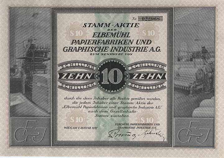 | Vorheriges Los | Zurück | Nächstes Los | | Losnr.: | 849 (Österreich) | | Titel: | Elbemühl Papierfabriken und Graphische Industrie AG | | Auflistung: | Aktie 10 S 1.1.1927. | | Ausruf: | 40,00 EUR | Ausgabe- datum: | 01.01.1927 | Ausgabe- ort: | Wien | | Abbildung: |  | | Stücknr.: | 15249 | | Info: | Gegründet 1873 in Wien unter der Firma Elbemühlfabriks- & Verlags-Gesellschaft. Das Unternehmen expandierte stark in Österreich, Böhmen und Mähren, mußte aber 1918 infolge des Zusammenbruchs der österreichisch-ungarischen Monarchie die in der Tschechoslowakei gelegenen Fabriken abtreten. 1923 Namensänderung in Elbemühl Papierfabriken und Graphische Industrie AG. Bis 1935 Notiz an der Wiener Börse. 1943 befanden sich 99 % des Aktienkapitals im Besitz des Fürsten Franz Josef von und zu Liechtenstein. Nach dem 2. Weltkrieg wurden betrieben eine Buch- und Kunstdruckerei (früher k.k. Hoftheaterdruckerei) im IX. Bezirk (Berggasse 31), eine Offset- und Rotationstiefdruckerei (früher Österr. Zeitungs- und Druckerei-AG) im III. Bezirk (Rüdengasse 11) sowie eine Großbuchbinderei im II. Bezirk (Obere Donaustr. 29, durch Bombenschaden total zerstört). | | Besonder-heiten: | Hochdekorative Aktiengestaltung mit zwei großen Darstellungen aus dem Druckereibetrieb. | | Verfügbar: | Doppelblatt, mit kpl. Kuponbogen. Unentwertet. | | Erhaltung: | EF | | Zuschlag: | offen |