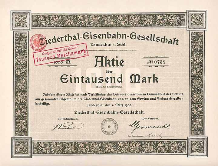 | Vorheriges Los | Zurück | Nächstes Los | | Losnr.: | 704 (Sammlung Eisenbahnen Deutschland) | | Titel: | Ziederthal-Eisenbahn-Gesellschaft | | Auflistung: | Aktie 1.000 Mark 1.3.1900. Gründeraktie (Auflage 1000, R 4). | | Ausruf: | 10,00 EUR | Ausgabe- datum: | 01.03.1900 | Ausgabe- ort: | Landeshut i.Schl. | | Abbildung: |  | | Stücknr.: | 541 | | Info: | Normalspurige Sekundärbahn in Niederschlesien von Landeshut nach Albendorf (21,6 km). | | Besonder-heiten: | Sehr großformatig (40 x 31 cm), mit schöner breiter Laubwerkumrandung. | | Verfügbar: | Nicht lochentwertet. Vertikale Knickfalte. (R 4) | | Erhaltung: | EF | | Zuschlag: | 25,00 EUR |