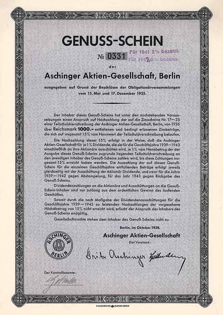 | Vorheriges Los | Zurück | Nächstes Los | | Losnr.: | 74 (Deutschland) | | Titel: | Aschinger AG | | Auflistung: | Genuss-Schein über 15 % von 1.000 RM Okt. 1938 (R 9). | | Ausruf: | 35,00 EUR | Ausgabe- datum: | 01.10.1938 | Ausgabe- ort: | Berlin | | Abbildung: |  | | Stücknr.: | 332 | | Info: | 1892 gegründet, ab 1900 AG. 1904 erwarb die Ges. die ersten Grundstücke, auf denen 1905 das Hotel Fürstenhof und das Weinhaus Reingold begonnen wurden. 1913 Erwerb des Palast-Hotels und 1924 der Mehrheit des Grundkapitals der Geka, Geschäfts- und Kontorhaus AG (Besitzerin des Pschorrhauses, gegenüber der Kaiser-Wilhelm-Gedächtnis-Kirche). Im gleichen Jahr erwarb die Ges. die Mehrheit des Grundkapitals der Berliner Hotel-Gesellschaft (Kaiserhof und Baltic) und im Jahr 1926 der Hotelbetriebs-AG (Bristol und Centralhotel). Traditionsreiches Gaststätten- und Hotel-Unternehmen. Aschinger war die bekannteste und größte Fa. in der Berliner Gastronomie und erlangte später vor allem durch die kostenlosen Schrippen Berühmtheit. 1947 übernimmt die Deutsche Treuhandstelle die im sowjetischen Sektor liegende Zentrale sowie die dazugehörenden Gaststätten. Die Teilgesellschaft West: 1950 Berliner Wertpapierbereinigung. 1971 Umwandlung in die noch heute existierende Einzelfirma Aschinger Gasthausbrauerei am Kurfürstendamm. | | Besonder-heiten: | Die Ausgabe dieser Genuss-Scheine erfolgte an Gläubiger einer 1926er Anleihe wegen eines bedingten Zinsverzichts. | | Verfügbar: | In dieser Form (NICHT entwertet!) äußerst selten. (R 9) | | Erhaltung: | UNC | | Zuschlag: | offen |