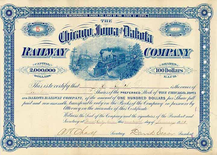 | Vorheriges Los | Zurück | Nächstes Los | | Losnr.: | 1021 (USA) | | Titel: | Chicago, Iowa & Dakota Railway | | Auflistung: | 12 pref. shares à 100 $ 19.1.1884. | | Ausruf: | 150,00 EUR | Ausgabe- datum: | 19.01.1884 | Ausgabe- ort: | Forest City, Iowa | | Abbildung: |  | | Stücknr.: | 5 | | Info: | Gründung 1882 zum Bau der 26 Meilen langen Bahn von Eldora Junc. nach Alden, Iowa. 1903 von der Chicago & North Western Ry. übernommen worden. Es war dies einer der letzten in einer 1884 begonnenen Serie von fast 20 Firmenkäufen, mit denen die C.&N.W.Ry. ihre Konzernstruktur zu vereinfachen suchte. | | Besonder-heiten: | Königsblauer Stahlstich, detailreiche Vignette eines Personenzuges mit viel Landschaft. | | Verfügbar: | Als pref. shares bei uns überhaupt erst ein einziges Mal (im Jahr 2003) versteigert worden. | | Erhaltung: | EF-. | | Zuschlag: | 180,00 EUR |