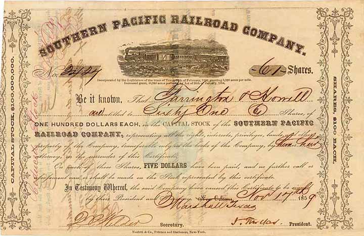 | Vorheriges Los | Zurück | Nächstes Los | | Losnr.: | 1169 (USA) | | Titel: | Southern Pacific Railroad | | Auflistung: | 61 shares á 100 $ 17.11.1859. | | Ausruf: | 200,00 EUR | Ausgabe- datum: | 17.11.1859 | Ausgabe- ort: | New Orleans (überschrieben: Marshall, Tx.) | | Abbildung: |  | | Stücknr.: | 2427 | | Info: | Konzessioniert 1852 durch den Staat Texas mit Landschenkungen von 5.120 (später 10.240) acres pro fertiggestellter Meile. Geplant war (zeitweise unter der Leitung von Thomas A. Scott, dem mächtigen späteren President der Pennsylvania RR) eine 800 Meilen lange Bahn von Shreveport, La. zum Rio Grande del Norte. Nur ein 66 Meilen langes Teilstück bis Longview, Tx. war 1871 fertig, als die Bahn von der Texas & Pacific Ry. übernommen wurde, auf deren Land die Southern Pacific ihre Schienen illegal verlegt hatte. Die Texas & Pacific plante eine (in dem Umfang aber nie fertiggestellte) 1.515 Meilen lange Verbindung bis San Diego am Pazifik. Dazu übernahm sie 1895-1932 mehrere andere kleinere Bahngesellschaften. Reiche Ölfunde im westlichen Texas Ende der 1920er Jahre (Öltransporte machten dann fast ein Viertel des Frachtgeschäfts aus) ließen die Bahn gut durch die Weltwirtschaftskrise kommen. Bis in die 1960er Jahre übernahm die Texas & Pacific kontinuierlich weitere Bahnen in Texas. Das Streckennetz war dadurch auf fast 2.000 Meilen gewachsen, als sie 1976 durch die Missouri Pacific übernommen wurde. | | Besonder-heiten: | Holzstich-Vignette mit Personenzug in den Weiten der Prairie, davor werden Rinder im Fluß getränkt. | | Verfügbar: | Unentwertet. Einzelstück aus einer uralten Sammlung. | | Erhaltung: | VF+. | | Zuschlag: | offen |