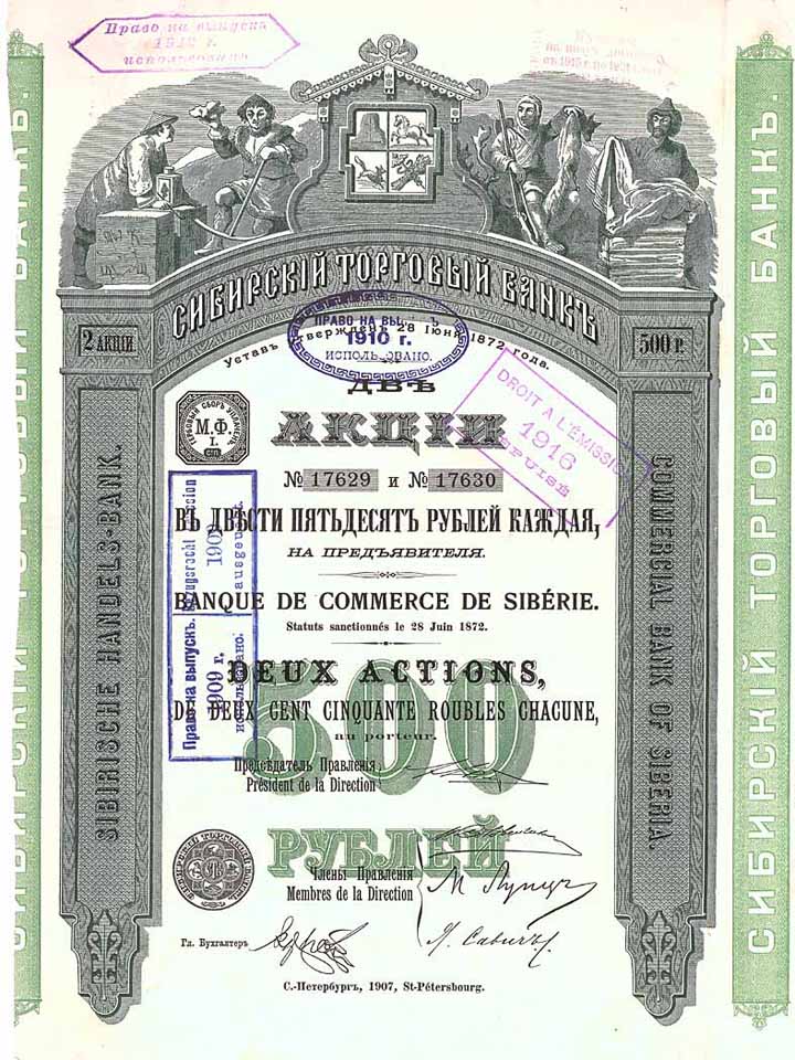 | Vorheriges Los | Zurück | Nächstes Los | | Losnr.: | 919 (Rußland) | | Titel: | Sibirische Handels-Bank | | Auflistung: | Aktie 2 x 250 Rbl. von 1907. | | Ausruf: | 25,00 EUR | Ausgabe- datum: | 01.01.1907 | Ausgabe- ort: | St.-Petersburg | | Abbildung: |  | | Stücknr.: | 17629-30 | | Info: | Die Sibirische Handelsbank wurde 1872 gegründet. Durch den 1891 begonnenen Bau der Transsibirischen Eisenbahn rückten die riesigen, bis dahin weitgehend unerschlossenen Gebiete östlich des Ural mit ihrem immensen Rohstoffreichtum stärker in den Blickpunkt der Finanzwelt. Zugleich betrieb der russische Finanzminister und spätere Ministerpräsident Witte eine liberale Politik, die privatem Auslandskapital alle denkbare Unterstützung angedeihen ließ. In Anbetracht der günstigen politischen Rahmenbedingungen und der unendlichen Reichtümer Sibiriens kam es kurz vor Ausbruch des 1. Weltkrieges zwischen deutschen und englischen Banken zu einem heftigen Kampf um die Aktienmehrheit an der Sibirischen Handels-Bank, in dessen Verlauf große Aktienpakete fast schon konspirativ mit Hilfe von Kurieren zwischen den beteiligten Ländern den Besitzer wechselten. | | Besonder-heiten: | Die ungewöhnlich schön gestaltete Aktie zeigt im Kopf die Reichtümer Sibiriens: Einen chinesischen Teehändler, einen mongolischen Bergmann, einen sibirischen Pelzjäger mit Flinte und erlegtem Silberfuchs sowie einen vorderasiatischen Tuchhändler. | | Verfügbar: | Restliche Kupons anhängend. | | Erhaltung: | EF-VF | | Zuschlag: | 30,00 EUR |
