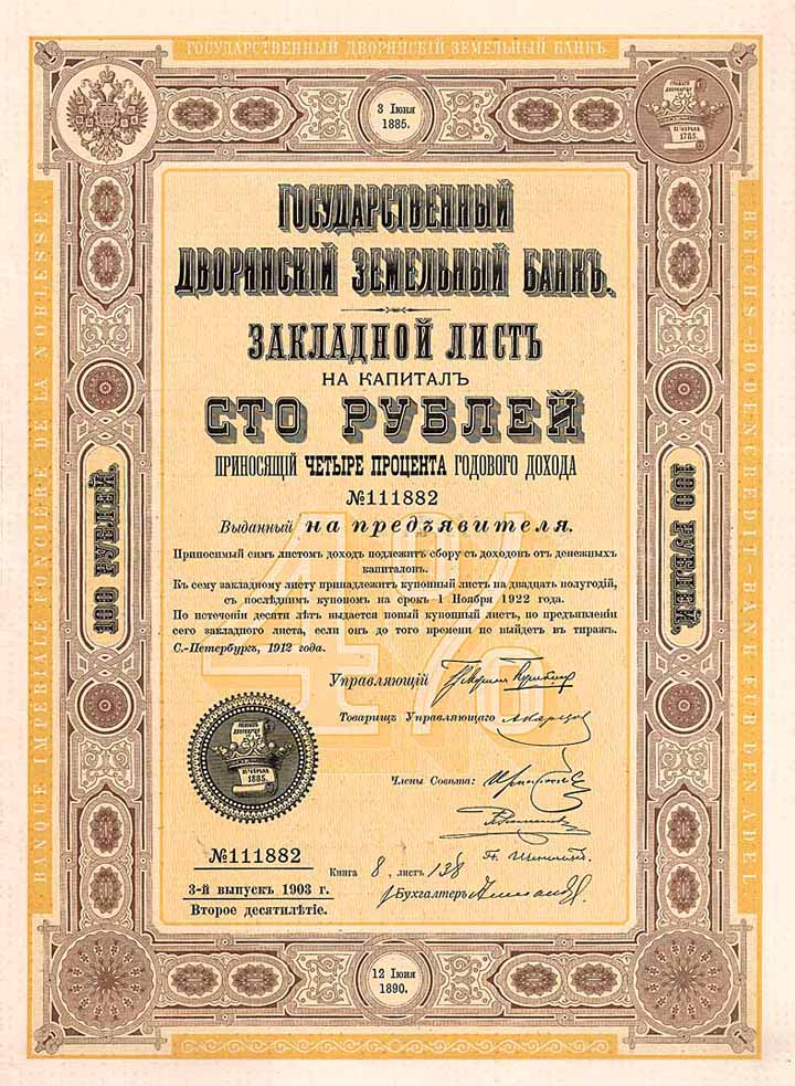 | Vorheriges Los | Zurück | Nächstes Los | | Losnr.: | 733 (Sammlung „Historische Wertpapiere aus aller Welt") | | Titel: | Reichs-Bodencredit-Bank für den Adel | | Auflistung: | 4 % Pfandbrief 100 Rbl. von 1912. | | Ausruf: | 10,00 EUR | Ausgabe- datum: | 01.01.1912 | Ausgabe- ort: | St. Petersburg | | Abbildung: |  | | Stücknr.: | 111879 | | Info: | Gegründet 1885 in Folge der im März 1861 erfolgten Bauernbefreiung in Russland als zentrales Bodenkreditinstitut für den hochverschuldeten und seine Vernichtung befürchtenden Landadel. | | Besonder-heiten: | Schönes Großformat. Rückseitig auch in deutsch/französisch. | | Verfügbar: | Kupons anhängend. | | Erhaltung: | VF+ | | Zuschlag: | 16,00 EUR |